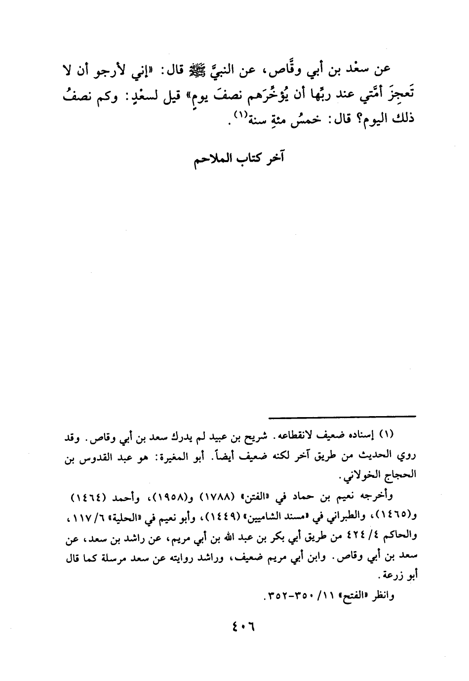 عن سعْد بن أبي وقاص، عن النبيَّ -صلَّى الله عليه وسلم- قال: "إني لأرجو أن لا تَعجِزَ أمَّتي عند ربِّها أن يُؤخِّرَهم نصفَ يومِ" قيل لسعدٍ: وكم نصفُ ذلك اليوم؟ قال: خمسُ مئةِ سنة (¬١).