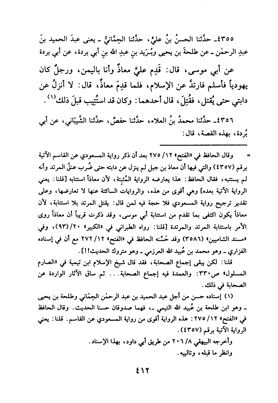 = وقال الحافظ في "الفتح" ١٢/ ٢٧٥ بعد أن ذكر رواية المسعودي عن القاسم الآتية برقم (٤٣٥٧) والتي فيها أن معاذ بن جبل لم ينزل عن دابته حتى ضُرب عنقُ المرتد وأنه لم يستتبه، فقال الحافظ: هذا يعارضه الرواية المُثبِتة؛ لأن معاذاً استتابه [قلنا: يعني الرواية الآتية بعده] وهي أقوى من هذه، والروايات الساكتة عنها لا تعارضها، وعلى تقدير ترجيح رواية المسعودي فلا حجة فيه لمن قال: يقتل المرتد بلا استتابة؛ لأن معاذاً يكون اكتفى بما تقدم من استتابة أبي موسى، وقد ذكرت قريباً أن معاذاً روى الأمر باستتابة المرتد والمرتدة [قلنا: رواه الطبراني في"الكبير" ٢٠/ (٩٣)، وفي "مسند الشاميين" (٣٥٨٦) وقد حَسَّنه الحافظ في "الفتح" ١٢/ ٢٧٢ مع أن في إسناده الفزارى -وهو محمَّد بن عُبيد الله العرزمي- وهو متروك الحديث!!].