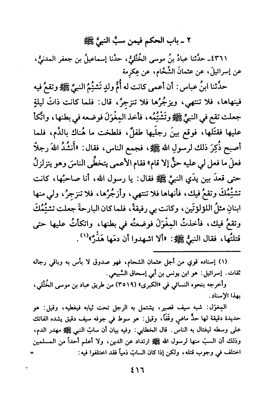 حدَّثنا ابنُ عباس: أن أعمى كانت له أُمُّ ولدٍ تَشتُمُ النبيَّ - صلَّى الله عليه وسلم - وتقعُ فيه فينهاها، فلا تنتهي، ويزجُرُها فلا تنزجِرُ، قال: فلما كانت ذاتَ ليلةٍ جعلت تقع في النبيَّ - صلَّى الله عليه وسلم - وتَشتِمُه، فأخذ المِغوَلَ فوضعه في بطنها، واتَكأ عليها فقتَلها، فوقع بينَ رجلَيها طفلٌ، فلطخت ما هُناك بالدَّم، فلما أصبح ذُكِرَ ذلك لرسولِ الله - صلَّى الله عليه وسلم -، فجمع الناس، فقال: "أَنشُدُ الله رجلاً فعلَ ما فعل لي عليه حقٌ إلا قام" فقام الأعمى يتخطَّى الناسَ وهو يتزلزلُ حتى قعدَ بين يدَي النبيَّ - صلَّى الله عليه وسلم - فقال: يا رسول الله، أنا صاحبُها، كانت تشتُمُكَ وتقعُ فيك، فأنهاها فلا تنتهي، وأزجُرُها، فلا تنزجِرُ، ولي منها ابنانِ مثلُ اللؤلؤتَين، وكانت بي رفيقةً، فلما كان البارحةَ جعلت تشتُمُكَ وتقعُ فيك، فأخذتُ المِغْوَلَ فوضعتُه في بطنها، واتكأتُ عليها حتى قتلتُها، فقال النبيَّ -صلَّى الله عليه وسلم-: "ألا اشهدوا أن دمَها هَدَرٌ" (¬١).