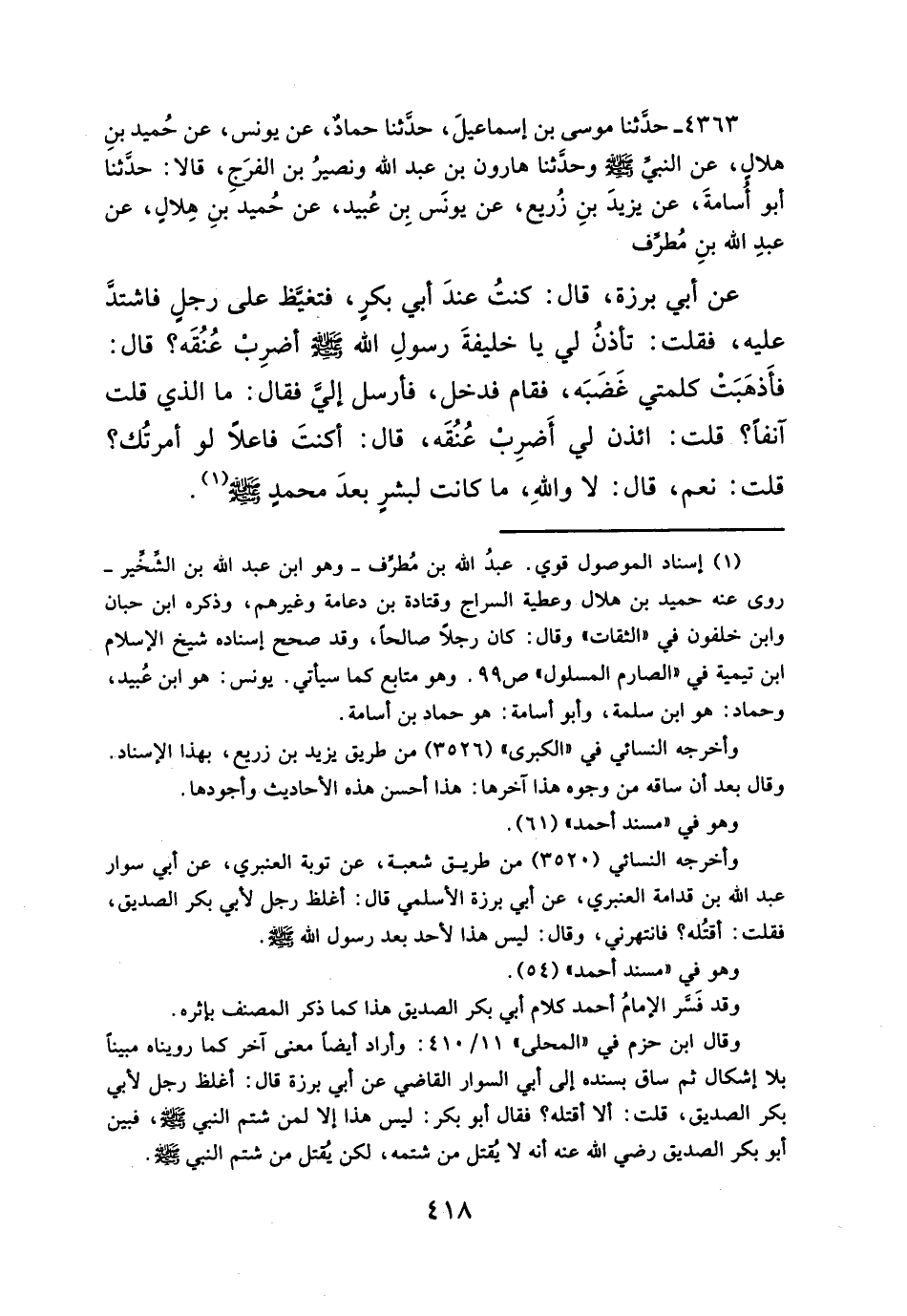 وأخرجه النسائي (٣٥٢٠) من طريق شعبة، عن توبة العنبري، عن أبي سوار عبد الله بن قدامة العنبري، عن أبي برزة الأسلمي قال: أغلظ رجل لأبي بكر الصديق، فقلت: أقتُله؟ فانتهرني، وقال: ليس هذا لأحد بعد رسول الله - صلَّى الله عليه وسلم.