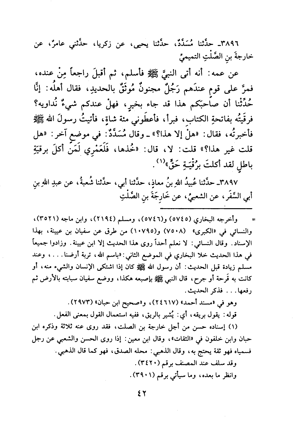 عن عمه: أنه أتى النبيَّ - صلَّى الله عليه وسلم - فأسلم، ثم أقبلَ راجعاً مِنْ عنده، فمرَّ على قومِ عندَهم رَجُلٌ مجنونٌ مُوثَقٌ بالحديدِ، فقال أهلُه: إنَّا حُدِّثْنا أن صاحبَكم هذا قد جاء بخيرٍ، فهلْ عندكم شيءٌ نُداويه؟ فرقَيتُه بفاتحةِ الكتابِ، فبرأ، فأعطَوني مئة شاةٍ، فأتيتُ رسولَ الله - صلَّى الله عليه وسلم - فاخبرتُه، فقال: "هلْ إلا هذا؟ " - وقال مُسَدَّدٌ: في موضعٍ آخر: "هل قلت غير هذا؟ " قلت: لا، قال: "خُذها، فَلَعَمْرِي لَمَن أكلَ برقيَةِ باطلِ لقد أكلتَ برُقْيَةِ حَقٍّ" (¬١).