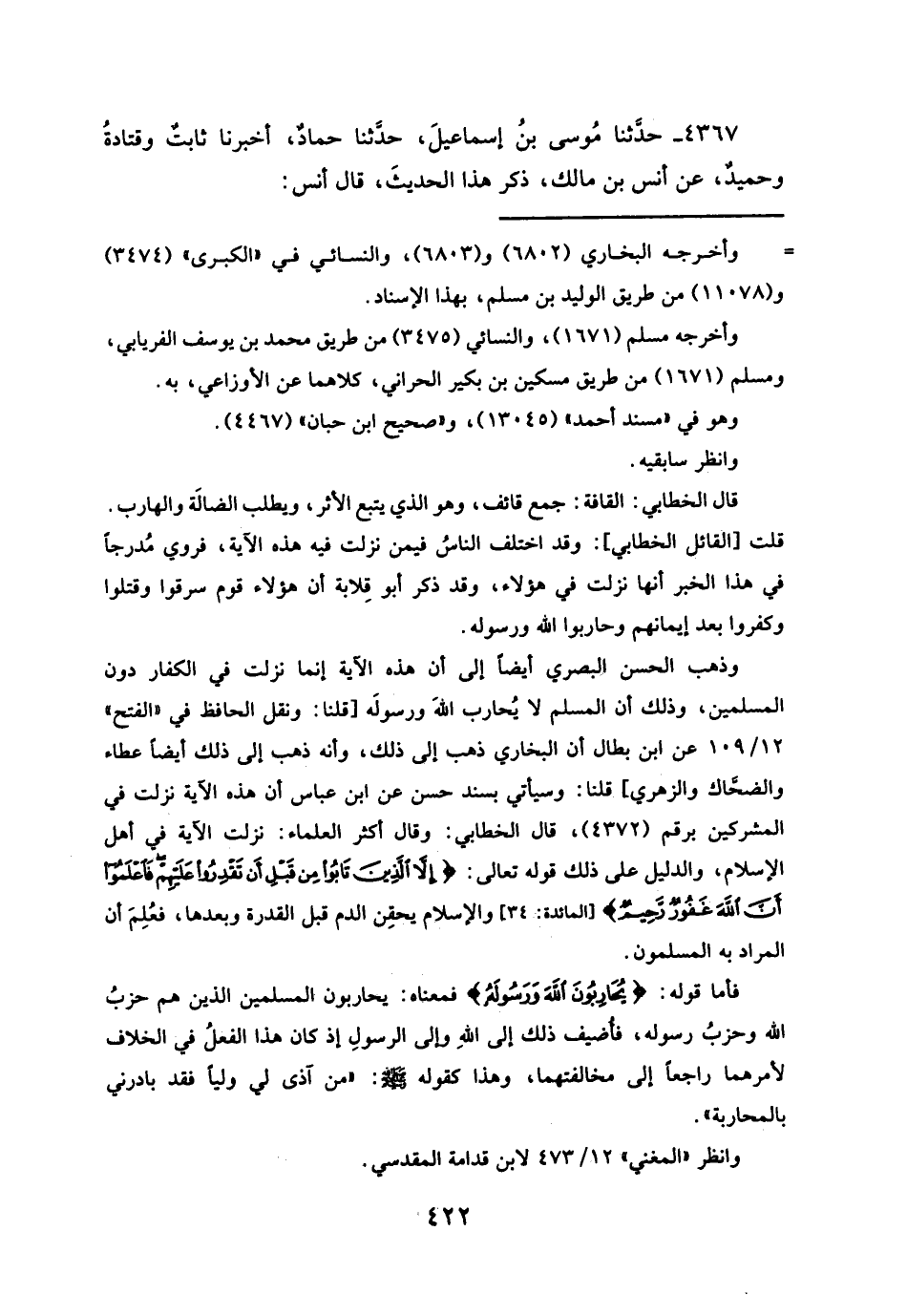 وذهب الحسن البصري أيضاً إلى أن هذه الآية إنما نزلت في الكفار دون المسلمين، وذلك أن المسلم لا يُحارب الله ورسولَه [قلنا: ونقل الحافظ في "الفتح" ١٢/ ١٠٩ عن ابن بطال أن البخاري ذهب إلى ذلك، وأنه ذهب إلى ذلك أيضاً عطاء والضحَّاك والزهري] قلنا: وسيأتي بسند حسن عن ابن عباس أن هذه الآية نزلت في المشركين برقم (٤٣٧٢)، قال الخطابي: وقال أكثر العلماء: نزلت الآية في أهل الإِسلام، والدليل على ذلك قوله تعالى: {إِلَّا الَّذِينَ تَابُوا مِنْ قَبْلِ أَنْ تَقْدِرُوا عَلَيْهِمْ فَاعْلَمُوا أَنَّ اللَّهَ غَفُورٌ رَحِيمٌ} [المائدة: ٣٤] والإسلام يحقِن الدم قبل القدرة وبعدها، فعُلِمَ أن المراد به المسلمون.