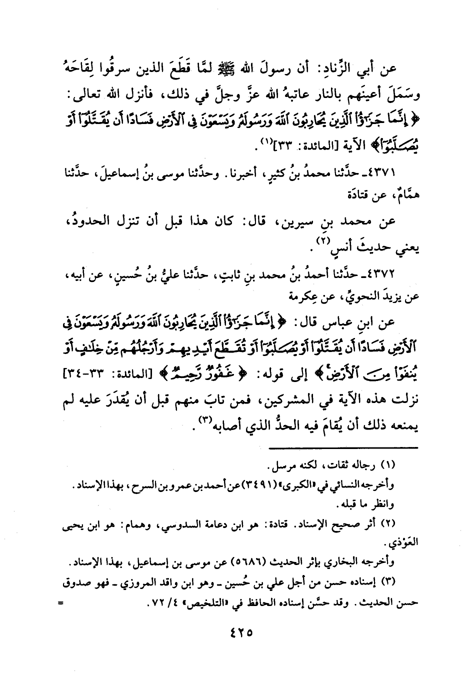عن ابنِ عباس قال: {إِنَّمَا جَزَاءُ الَّذِينَ يُحَارِبُونَ اللَّهَ وَرَسُولَهُ وَيَسْعَوْنَ فِي الْأَرْضِ فَسَادًا أَنْ يُقَتَّلُوا أَوْ يُصَلَّبُوا أَوْ تُقَطَّعَ أَيْدِيهِمْ وَأَرْجُلُهُمْ مِنْ خِلَافٍ أَوْ يُنْفَوْا مِنَ الْأَرْضِ} إلى قوله: {غَفُورٌ رَحِيمٌ} [المائدة: ٣٣ - ٣٤] نزلت هذه الآية في المشركين، فمن تابَ منهم قبل أن يُقدَرَ عليه لم يمنعه ذلك أن يُقامَ فيه الحدُّ الذي أصابه (¬٣).