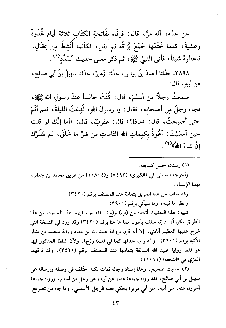 عن عمِّه، أنه مرَّ، قال: فرقَاه بِفَاتحةِ الكتَابِ ثلاثة أيامٍ غُدْوةً وعشيةً، كما خَتَمَها جَمَعَ بُزَاقُه ثم تفل، فكأنما أُنْشِطَ مِن عِقَالٍ، فأعطوهُ شيئاً، فأتى النبيَّ - صلَّى الله عليه وسلم -، ثم ذكر معنى حديث مُسَدَّدٍ (¬١).