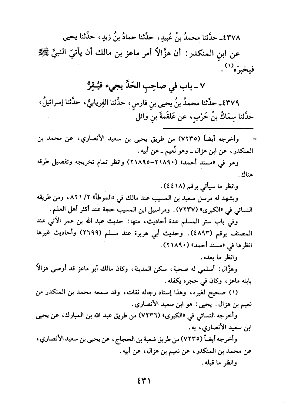 = وأخرجه أيضاً (٧٢٣٥) من طريق يحيى بن سعيد الأنصاري، عن محمَّد بن المنكدر، عن ابن هزال -وهو نُعيم- عن أبيه.
