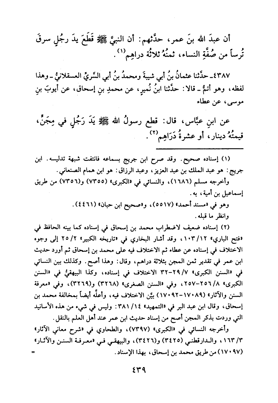 (¬٢) إسناده ضعيف لاضطراب محمَّد بن إسحاق في إسناده كما بينه الحافظ في "فتح الباري" ١٢/ ١٠٣، وقد أشار البخاري في "تاريخه الكبير" ٢/ ٢٥ إلى وجوه الاختلاف في إسناده عن عطاء ثم الاختلاف فيه على محمَّد بن إسحاق ثم أورد حديث ابن عمر في تقدير ثمن المجن بثلاثة دراهم، وقال: وهذا أصح. وكذلك بين النسائي في "السنن الكبرى" ٧/ ٢٩ - ٣٢ الاختلاف في إسناده، وكذا البيهقي في السنن "الكبرى" ٨/ ٢٥٦ - ٢٥٧، وفي "السنن الصغرى" (٣٢٦٨) و (٣٢٦٩)، وفي "معرفة السنن والآثار" (١٧٠٨٩ - ١٧٠٩٢) بيَّن الاختلاف فيه، وأعلَّه أيضاً بمخالفة محمَّد بن إسحاق، وقال ابن عبد البر في "التمهيد" ١٤/ ٣٨١: وليس في شيء من هذه الأسانيد التي وردت بذكر المجن أصح من إسناد حديث ابن عمر عند أهل العلم بالنقل.