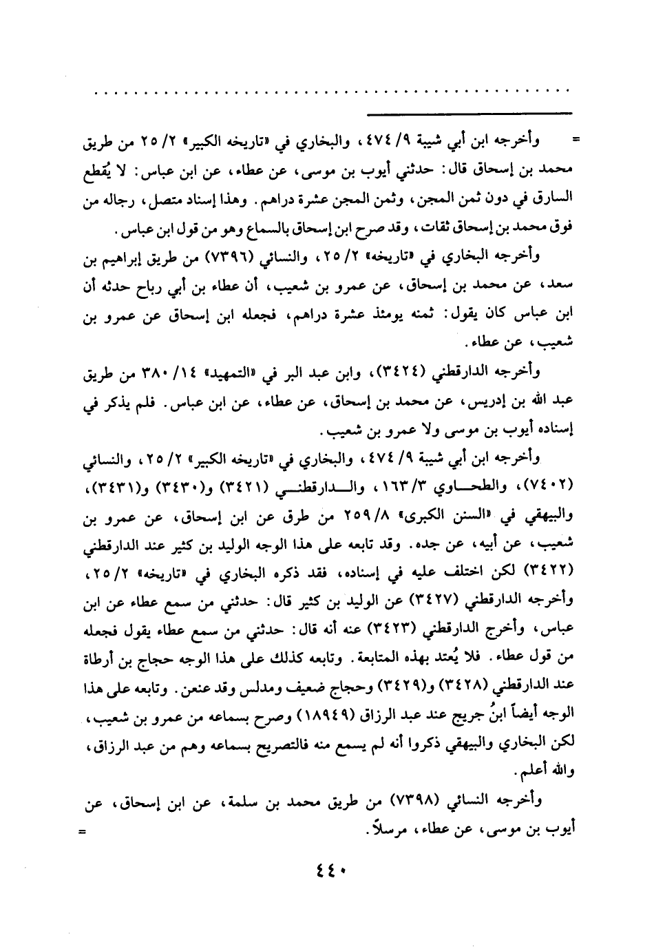 = وأخرجه ابن أبي شيبة ٩/ ٤٧٤، والبخاري في "تاريخه الكبير" ٢/ ٢٥ من طريق محمَّد بن إسحاق قال: حدثني أيوب بن موسى، عن عطاء، عن ابن عباس: لا يُقطع السارق في دون ثمن المجن، وثمن المجن عشرة دراهم. وهذا إسناد متصل، رجاله من فوق محمَّد بن إسحاق ثقات، وقد صرح ابن إسحاق بالسماع وهو من قول ابن عباس.