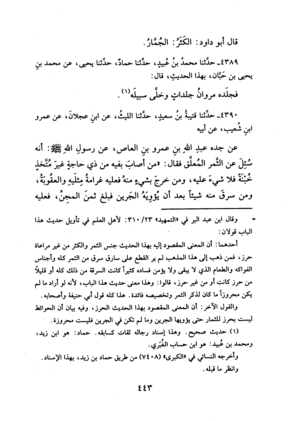 عن جده عبدِ اللهِ بنِ عمرو بنِ العاص، عن رسولِ الله -صلَّى الله عليه وسلم-: أنه سُئِلَ عن الثَّمر المُعلَّق فقال: "من أصابَ بفيه من ذي حاجةٍ غيرَ مُتَّخذٍ خُبْنَةً فلا شيءَ عليه، ومن خرجَ بشيءٍ منهُ فعليه غرامةُ مِثلَيهِ والعقُوبَةُ، ومن سرقَ منه شيئاً بعد أن يُؤوِيَهُ الجَرين فبلغ ثمنَ المجِنِّ، فعليه