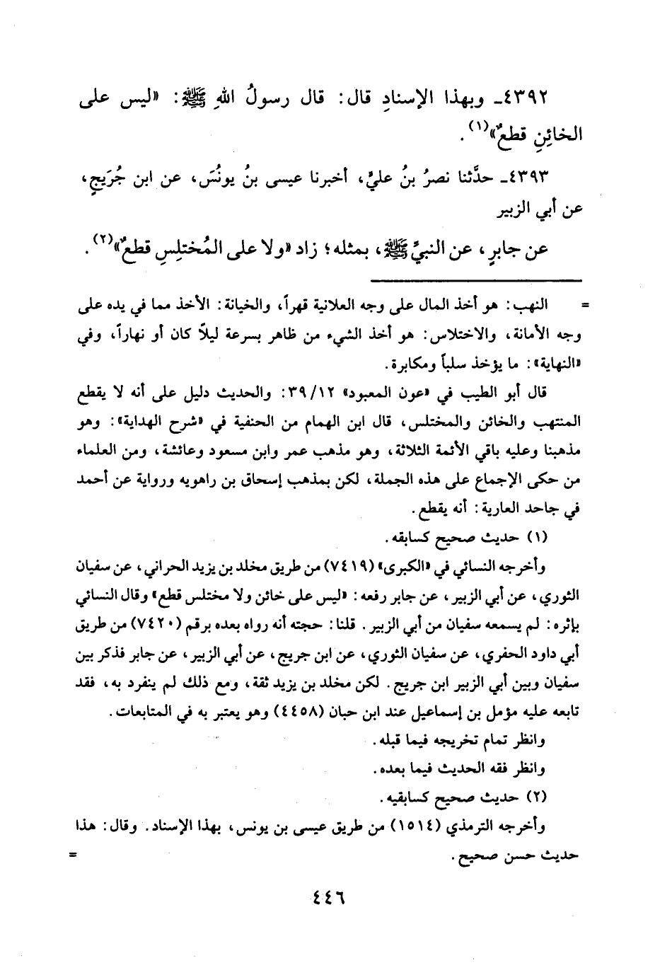 ٤٣٩٣ - حدَّثنا نصرُ بنُ عليٍّ، أخبرنا عيسى بنُ يونُسَ، عن ابن جُرَيجٍ، عن أبي الزبير عن جابرٍ، عن النبيِّ - صلَّى الله عليه وسلم -، بمثله؛ زاد "ولا على المُختلِسِ قطعٌ" (¬٢).