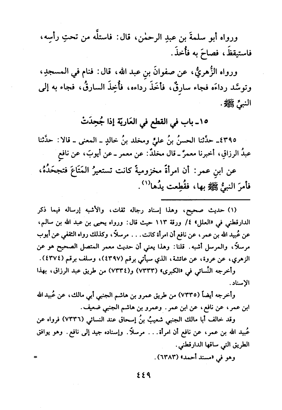 ورواه أبو سلمةَ بن عبدِ الرحمن، قال: فاستلَّه من تحتِ رأسِه، فاستيقظَ، فصاحَ به فأُخذَ. ورواه الزُّهريُّ، عن صفوانَ بنِ عبد الله، قال: فنام في المسجدِ، وتوسَّد رداءَه فجاء سارِقٌ فأخَذَ رداءه، فأخِذَ السارقُ، فجاء به إلى النبي - صلَّى الله عليه وسلم -.