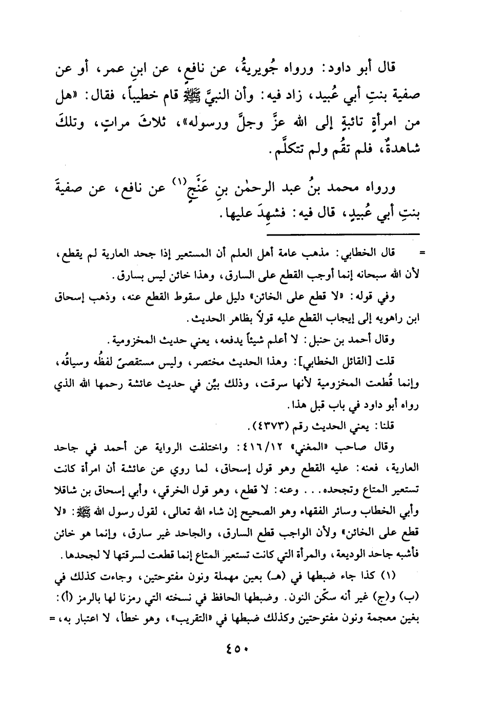 قال أبو داود: ورواه جُويريةُ، عن نافعٍ، عن ابنِ عمر، أو عن صفية بنتِ أبي عُبيد، زاد فيه: وأن النبيَّ - صلَّى الله عليه وسلم - قام خطيباً، فقال: "هل من امرأةٍ تائبةٍ إلى الله عزَّ وجلَّ ورسوله"، ثلاثَ مراتٍ، وتلكَ شاهدةٌ، فلم تقُم ولم تتكلَّم.