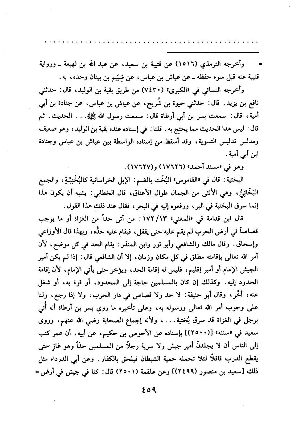 قال ابن قدامة في "المغني" ١٣/ ١٧٢: من أتى حداً من الغزاة أو ما يوجب قصاصاً في أرض الحرب لم يقم عليه حتى يقفل، فيقام عليه حدُّه، وبهذا قال الأوزاعي وإسحاق. وقال مالك والشافعي وأبو ثور وابن المنذر: يقام الحد في كل موضع؛ لأن أمر الله تعالى بإقامته مطلق في كل مكان وزمان، إلا أن الشافعي قال: إذا لم يكن أمير الجيش الإِمام أو أمير إقليم، فليس له إقامة الحد، ويؤخر حتى يأتي الإِمام؛ لأن إقامة الحدود إليه. وكذلك إن كان بالمسلمين حاجة إلى المحدود، أو قوة به، أو شغل عنه، أخِّر، وقال أبو حنيفة: لا حد ولا قصاص في دار الحرب، ولا إذا رجع، ولنا على وجوب أمر الله تعالى ورسوله به، وعلى تأخيره ما روى بسر بن أرطأة أنه أُتي برجل في الغزاة قد سرق بُختية ... ، ولأنه إجماع الصحابة رضي الله عنهم، وروى سعيد في "سننه" [(٢٥٠٠)] بإسناده عن الأحوص بن حكيم، عن أبيه، أن عمر كتب إلى الناس أن لا يجلدنّ أمير جش ولا سرية رجلاً من المسلمين حداً وهو غازٍ حتى يقطع الدرب قافلاً لئلا تحمله حمية الشيطان فيلحق بالكفار. وعن أبي الدرداء مثل ذلك [سعيد بن منصور (٢٤٩٩)] وعن علقمة (٢٥٠١) قال: كنا في جش في أرض =