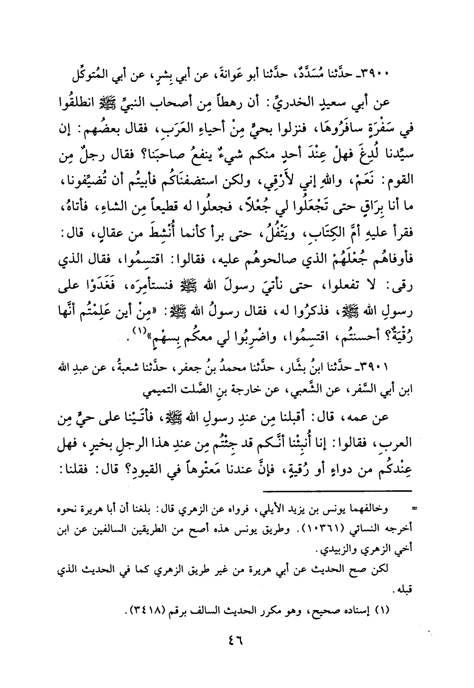 عن أبي سعيدٍ الخدريِّ: أن رهطاً مِن أصحاب النبي - صلَّى الله عليه وسلم - انطلقُوا في سَفْرَةٍ سافَرُوهَا، فنزلوا بحيٍّ مِنْ أحياءِ العَرَبِ، فقال بعضُهم: إن سيَّدنا لُدِغَ فهلْ عِنْدَ أحدٍ منكم شيءٌ ينفعُ صاحبَنا؟ فقال رجلٌ مِن القوم: نَعَمْ، واللهِ إني لأَرْقِي، ولكن استضفنَاكُم فأبيتُم أن تُضيِّفونا، ما أنا بِرَاقٍ حتى تَجْعَلُوا لي جُعْلاً، فجعلُوا له قطيعاً مِن الشاءِ، فأتاهُ، فقرأ عليهِ أمَّ الكِتَابِ، ويَتْفُلُ، حتى برأ كأنما أُنْشِطَ من عقالٍ، قال: فأوفاهُم جُعْلَهُمْ الذي صالحوهُم عليه، فقالوا: اقتسِمُوا، فقال الذي رقى: لا تفعلوا، حتى نأتيَ رسولَ الله - صلَّى الله عليه وسلم - فنستأمِرَه، فَغَدَوْا على رسولِ الله - صلَّى الله عليه وسلم -، فذكرُوا له، فقال رسولُ الله - صلَّى الله عليه وسلم -: "مِنْ أين عَلِمْتُم أنَّها رُقْيَةٌ؟ أحسنتُم، اقتسِمُوا، واضْرِبُوا لي معكُم بِسهْمٍ" (¬١).