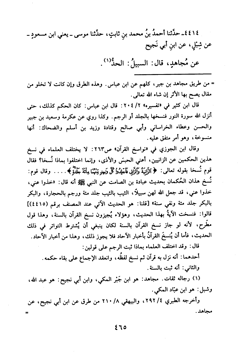 بالبكر جلد مئة ونفي سنة" [قلنا: هو الحديث الآتي عند المصنف برقم (٤٤١٥)]