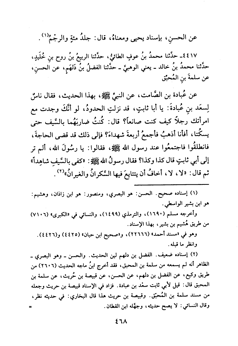 ٤٤١٧ - حدَّثنا محمدُ بنُ عوفٍ الطائيُّ، حدَّثنا الربيعُ بنُ روح بنِ خُلَيدٍ، حدَّثنا محمدُ بنُ خالد -يعني الوهبيَّ- حدَّثنا الفضلُ بنُ دَلهَمٍ، عن الحسنِ، عن سلمةَ بنِ المُحبِّق عن عُبادة بن الصَّامت، عن النبي - صلَّى الله عليه وسلم -، بهذا الحديث، فقال ناسٌ لِسعَد بنِ عُبادةَ: يا أبا ثابتٍ، قد نزلتِ الحدودُ، لو أنَّكَ وجدت مع امرأتك رجلاً كيف كنت صانعاً؟ قال: كُنتُ ضاربَهُما بالسَّيف حتى يسكُتا، أفأنا أذهبُ فأجمعُ أربعةَ شهداءَ؟ فإلى ذلك قد قضى الحاجةَ، فانطلقُوا فاجتمعُوا عند رسول الله - صلَّى الله عليه وسلم -، فقالوا: يا رسُولَ الله، ألم تر إلى أبي ثابتٍ قال كذا وكذا؟ فقال رسولُ الله - صلَّى الله عليه وسلم -: "كفى بالسَّيفِ شاهِداً" ثم قال: "لا، لا، أخافُ أن يتتايعَ فيها السَّكرانُ والغيرانُ" (¬٢).