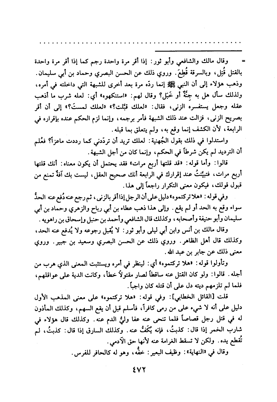 قلت [القائل الخطابي]: وفي قوله: "هلا تركتموه" على معنى المذهب الأول دليل على أنه لا شيء على من رمى كافراً، فأسلم قبل أن يقع السهم، وكذلك المأذون له في قتل رجل قصاصاً فلما تنحى عنه عفا وليُّ الدم عنه. وكذلك قال هؤلاء في شارب الخمر إذا قال: كذبتُ، فإنه يُكَفُّ عنه. وكذلك السارق إذا قال: كذبتُ، لم تُقطع يده. ولكن لا تسقط الغرامة عنه لأنها حق الآدمي.