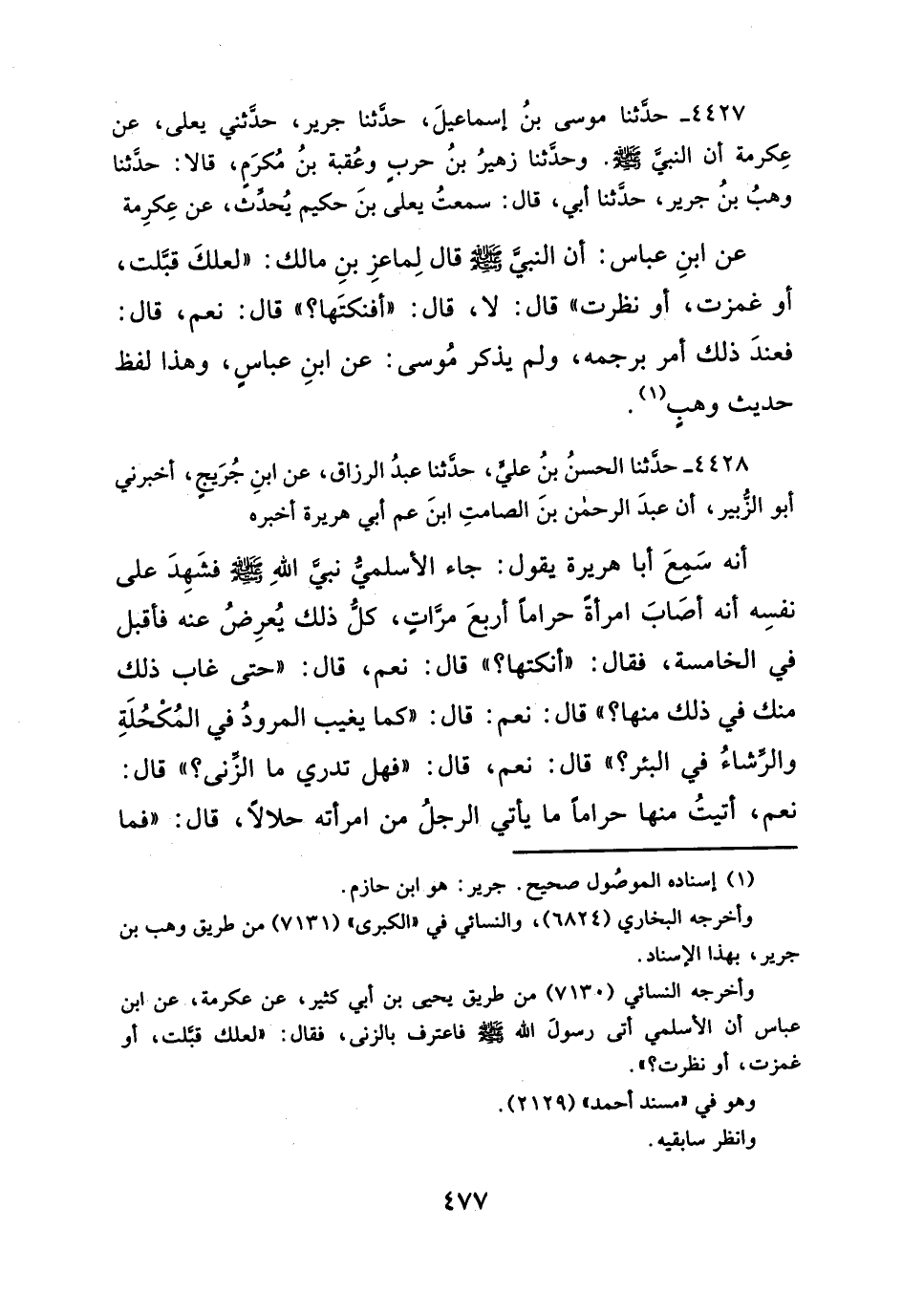 عن ابنِ عباس: أن النبيَّ - صلَّى الله عليه وسلم - قال لِماعزِ بنِ مالك: "لعلكَ قبَّلت، أو غمزت، أو نظرت" قال: لا، قال: "أفنكتَها؟ " قال: نعم، قال: فعندَ ذلك أمر برجمه، ولم يذكر مُوسى: عن ابنِ عباسٍ، وهذا لفظ حديث وهبٍ (¬١).