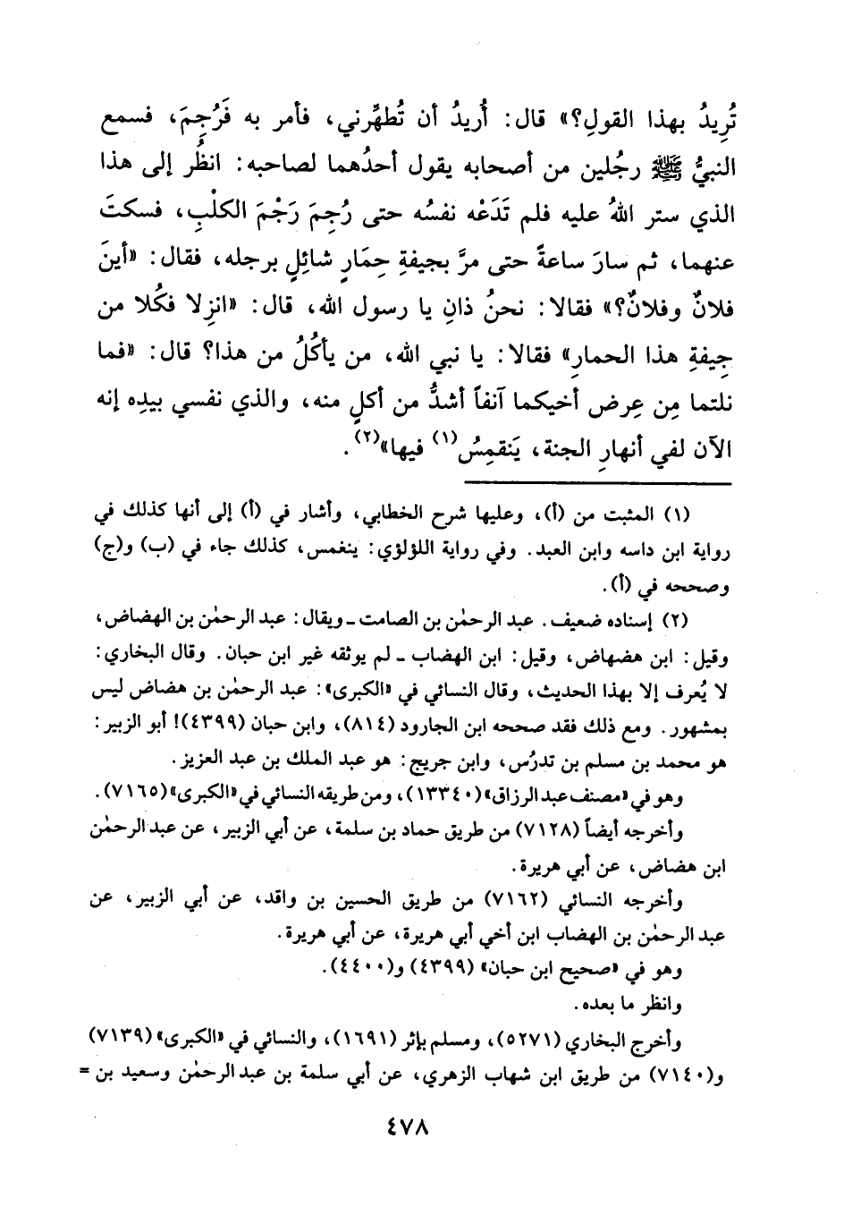 تُرِيدُ بهذا القولِ؟، قال: أريدُ أن تُطهِّرني، فأمر به فَرُجِمَ، فسمع النبيُّ -صلَّى الله عليه وسلم- رجُلين من أصحابه يقول أحدُهما لصاحبه: انظُر إلى هذا الذي ستر اللهُ عليه فلم تَدَعْه نفسُه حتى رُجِمَ رَجمَ الكلبِ، فسكتَ عنهما، ثم سارَ ساعةً حتى مرَّ بجيفةِ حِمَارٍ شائِلٍ برجله، فقال: "أينَ فلانٌ وفلانٌ؟ " فقالا: نحنُ ذانِ يا رسول الله - صلَّى الله عليه وسلم، قال: "انزِلا فكُلا من جِيفةِ هذا الحمارِ" فقالا: يا نبي الله، من يأكُلُ من هذا؟ قال: "فما نلتما مِن عِرض أخيكما آنفاً أشدُّ من أكلٍ منه، والذي نفسي بيدِه إنه الآن لفي أنهارِ الجنة، يَنقمِسُ (¬١) فيها، (¬٢).