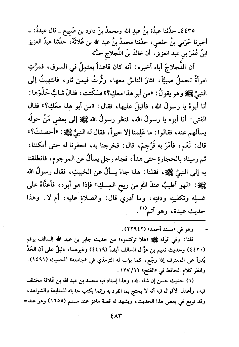 أن اللَّجلاجَ أباه أخبره: أنه كان قاعداً يعتمِلُ في السوق، فمرَّتِ امرأةٌ تحملُ صبيَّاً، فثارَ الناسُ معها، وثُرتُ فيمن ثار، فانتهيتُ إلى النبي - صلَّى الله عليه وسلم - وهو يقولُ: "من أبو هذا معكِ؟ " فسَكَتت، فقالَ شابٌّ حَذوَها: أنا أبوهُ يا رسولَ الله - صلَّى الله عليه وسلم -، فأقبلَ عليها، فقال: "من أبو هذا معَكِ؟ " فقال الفتى: أنا أبوه يا رسولَ الله، فنظر رسولُ الله - صلَّى الله عليه وسلم - إلى بعضِ مَنْ حولَه يسألهم عنه، فقالوا: ما عَلِمنا إلا خيراً، فقال له النبي - صلَّى الله عليه وسلم -: "أحصنتَ؟ " قال: نعَم، فأمَرَ به فَرُجِمَ، قال: فخرجنا به، فحفرنا له حتى أمكننا، ثم رميناه بالحجارةِ حتى هدأ، فجاء رجل يسألُ عن المرجوم، فانطلقنا به إلى النبي - صلَّى الله عليه وسلم -، فقلنا: هذا جاءَ يسألُ عن الخبيثِ، فقال رسولُ الله - صلَّى الله عليه وسلم -: "لهو أطيبُ عندَ اللهِ من ريحِ المِسكِ" فإذا هو أبوه، فأعنَّاهُ على غسلِه وتكفينه ودفنِه، وما أدري قال: والصلاةِ عليه، أم لا. وهذا حديث عبدة، وهو أتم (¬١).