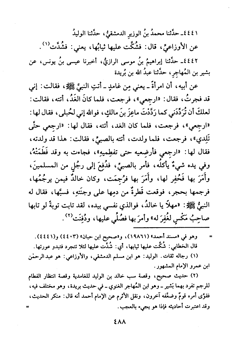 (¬٢) حديث صحيح، وقصة سب خالد بن الوليد للغامدية وقصة انتظار الفطام للرجم تفرد بهما بَشير -وهو ابن المُهاجر الغنوي- في حديث بريدة، وهو مختلف فيه، فقوَّى أمره قومٌ وضعَّفه آخرون، ونقل الأثرم عن الإِمام أحمد أنه قال: منكر الحديث، وقد اعتبرت أحاديثه فإذا هو يجيء بالعجب. =
