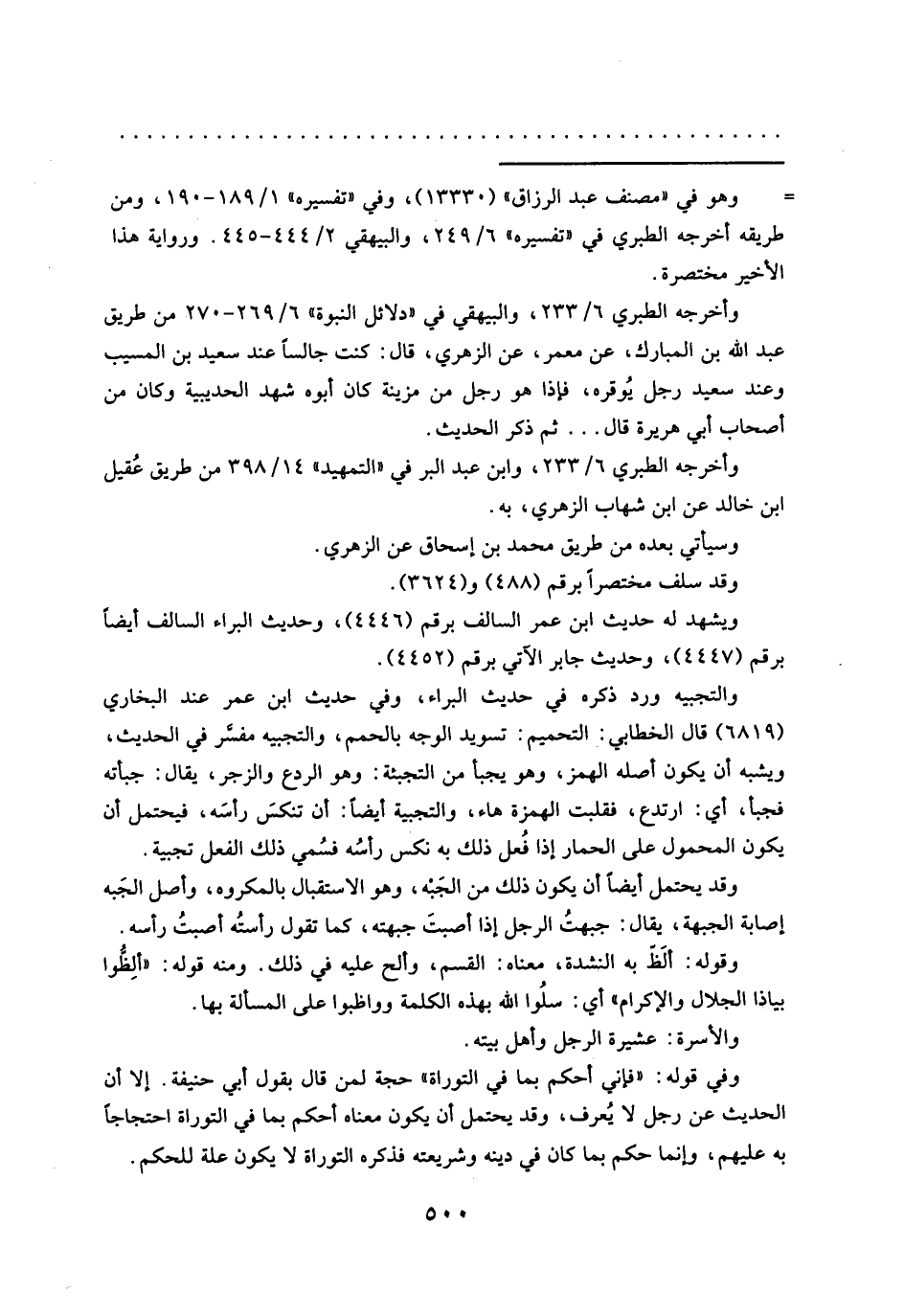وفي قوله: "فإني أحكم بما في التوراة" حجة لمن قال بقول أبي حنيفة. إلا أن الحديث عن رجل لا يُعرف، وقد يحتمل أن يكون معناه أحكم بما في التوراة احتجاجاً به عليهم، وإنما حكم بما كان في دينه وشريعة فذكره التوراة لا يكون علة للحكم.