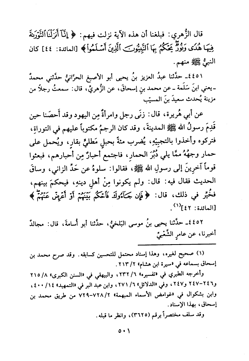 عن أبي هُريرة، قال: زنَى رجل وامرأةٌ مِن اليهود وقد أَحصَنا حين قَدِمَ رسولُ الله - صلَّى الله عليه وسلم - المدينةَ، وقد كان الرجمُ مكتوباً عليهم في التوراةِ، فتركوه وأخذوا بالتجبِيْهِ، يُضرب مئةً بحبلٍ مَطليٍّ بقارٍ، ويُحمل على حمار وجهُهُ مِمَّا يلي دُبُرَ الحمارِ، فاجتمع أحبارٌ مِن أحبارهم، فبعثوا قوماً آخرِينَ إلى رسولِ الله - صلَّى الله عليه وسلم -، فقالوا: سلوهُ عن حَدِّ الزاني، وساقَ الحديث فقال فيه: قال: ولم يكونوا مِنْ أهلِ دينهِ، فيحكمَ بينهم، فخُيِّر في ذلك، قال: {فَإِنْ جَاءُوكَ فَاحْكُمْ بَيْنَهُمْ أَوْ أَعْرِضْ عَنْهُمْ} ٌ [المائدة:٤٢] (¬١).