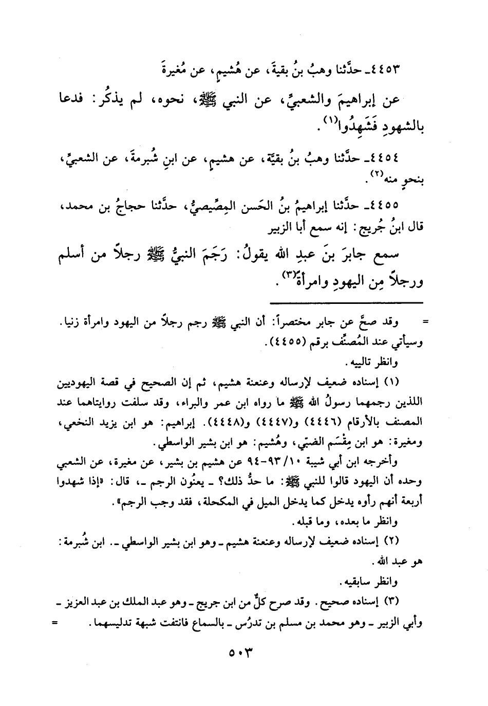 (¬١) إسناده ضعيف لإرساله وعنعنة هشيم، ثم إن الصحيح في قصة اليهوديين اللذين رجمهما رسولُ الله - صلَّى الله عليه وسلم - ما رواه ابن عمر والبراء، وقد سلفت روايتاهما عند المصنف بالأرقام (٤٤٤٦) و (٤٤٤٧) و (٤٤٤٨). إبراهيم: هو ابن يزيد النخعي، ومغيرة: هو ابن مِقسَم الضبّي، وهُشيم: هو ابن بشير الواسطي.