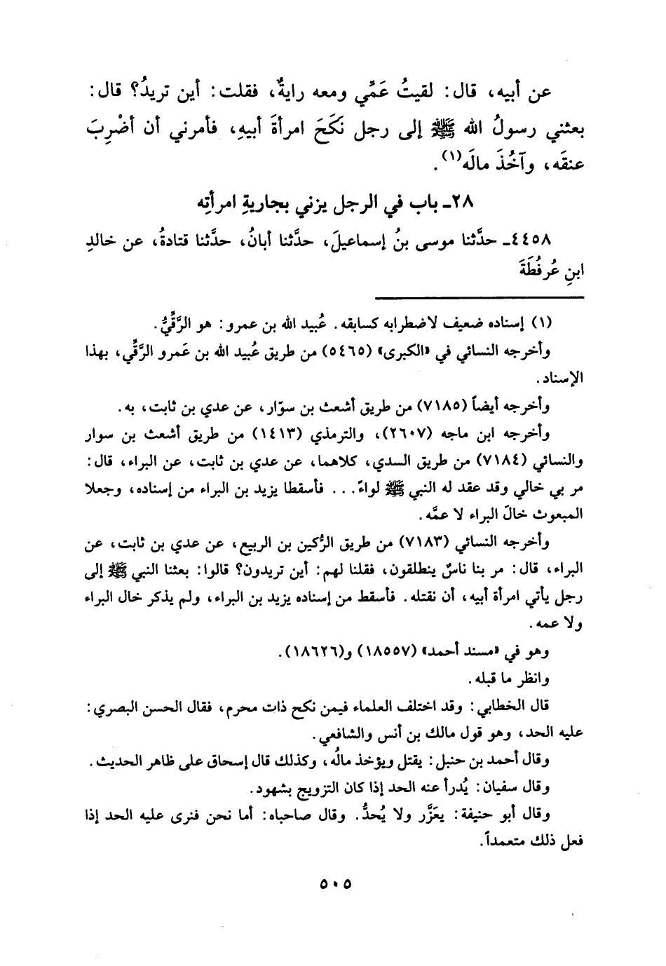 عن أبيه، قال: لقيتُ عَمِّي ومعه رايةٌ، فقلت: أين تريدُ؟ قال: بعثني رسولُ الله - صلَّى الله عليه وسلم - إلى رجل نكَحَ امرأةَ أبيهِ، فأمرني أن أضْرِبَ عنقَه، وآخُذَ مالَه (¬١).