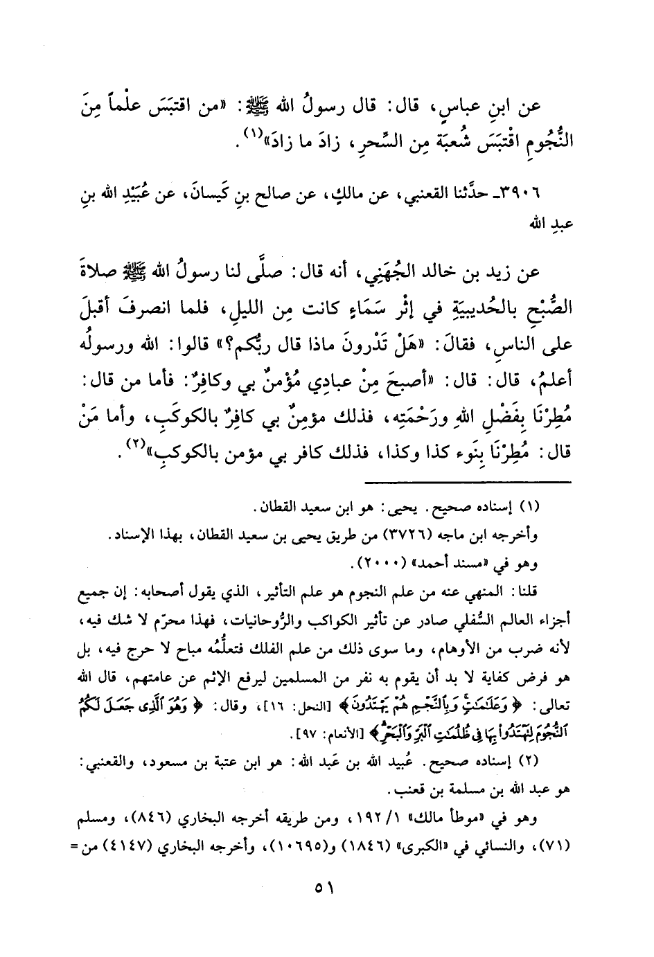 ٣٩٠٦ - حدَّثنا القعنبيُّ، عن مالكٍ، عن صالح بنِ كَيسانَ، عن عُبَيْدِ الله بنِ عبدِ الله عن زيد بن خالد الجُهَنِي، أنه قال: صلَّى لنا رسولُ الله - صلَّى الله عليه وسلم - صلاةَ الصُّبْحِ بالحُديبيَةِ في إثْر سَمَاءٍ كانت مِن الليلِ، فلما انصرفَ أقبلَ على الناسِ، فقالَ: "هَلْ تَدْرونَ ماذا قال ربُّكم؟ " قالوا: الله ورسولُه أعلمُ، قال: قال: "أصبحَ مِنْ عبادِي مُؤْمنٌ بي وكافِرٌ: فأما من قال: مُطِرْنَا بِفَضْلِ اللهِ ورَحْمَتِه، فذلك مؤمِنٌ بي كافِرٌ بالكوكَبِ، وأما مَنْ قال: مُطِرْنَا بِنَوء كذا وكذا، فذلك كافر بي مؤمن بالكوكبِ" (¬٢).