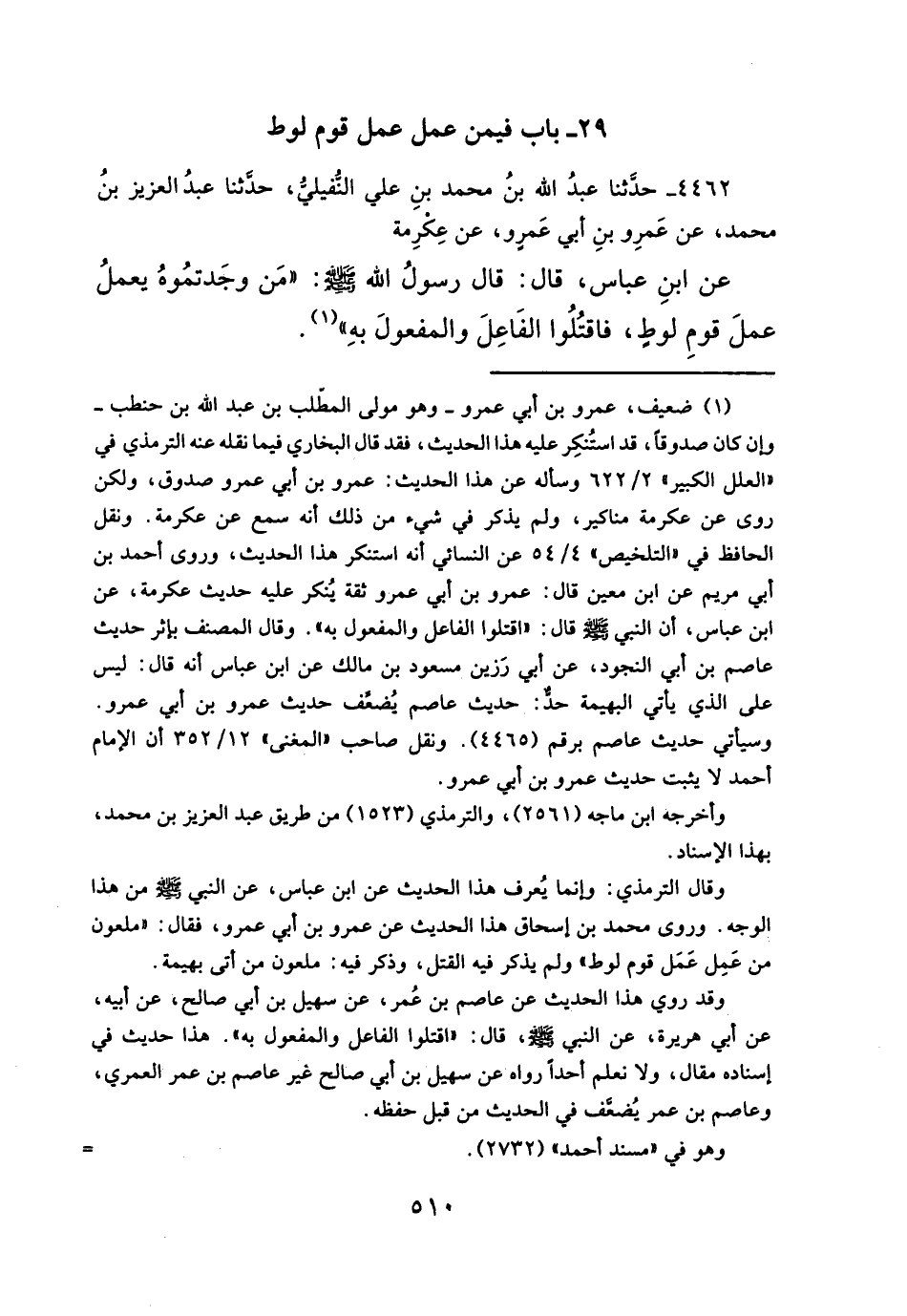 وقال الترمذي: وإنما يُعرف هذا الحديث عن ابن عباس، عن النبي - صلَّى الله عليه وسلم - من هذا الوجه. وروى محمَّد بن إسحاق هذا الحديث عن عمرو بن أبي عمرو، فقال: "ملعون من عَمِل عَمَل قوم لوط" ولم يذكر فيه القتل، وذكر فيه: ملعون من أتى بهيمة.