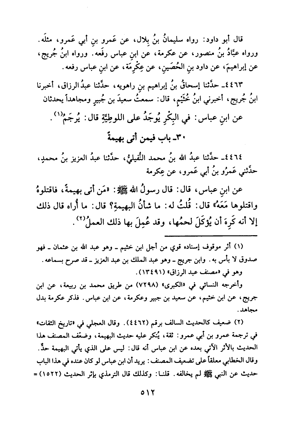 عن ابنِ عباس، قال: قال رسولُ الله - صلَّى الله عليه وسلم -: "مَن أتى بهيمةً، فاقتلوهُ واقتلوها مَعَهم" قال: قُلتُ له: ما شأنُ البهيمةِ؟ قال: ما أُراه قال ذلك إلا أنه كَرِهَ أن يُؤكَلَ لحمُها، وقد عُمِلَ بها ذلك العملُ (¬٢).
