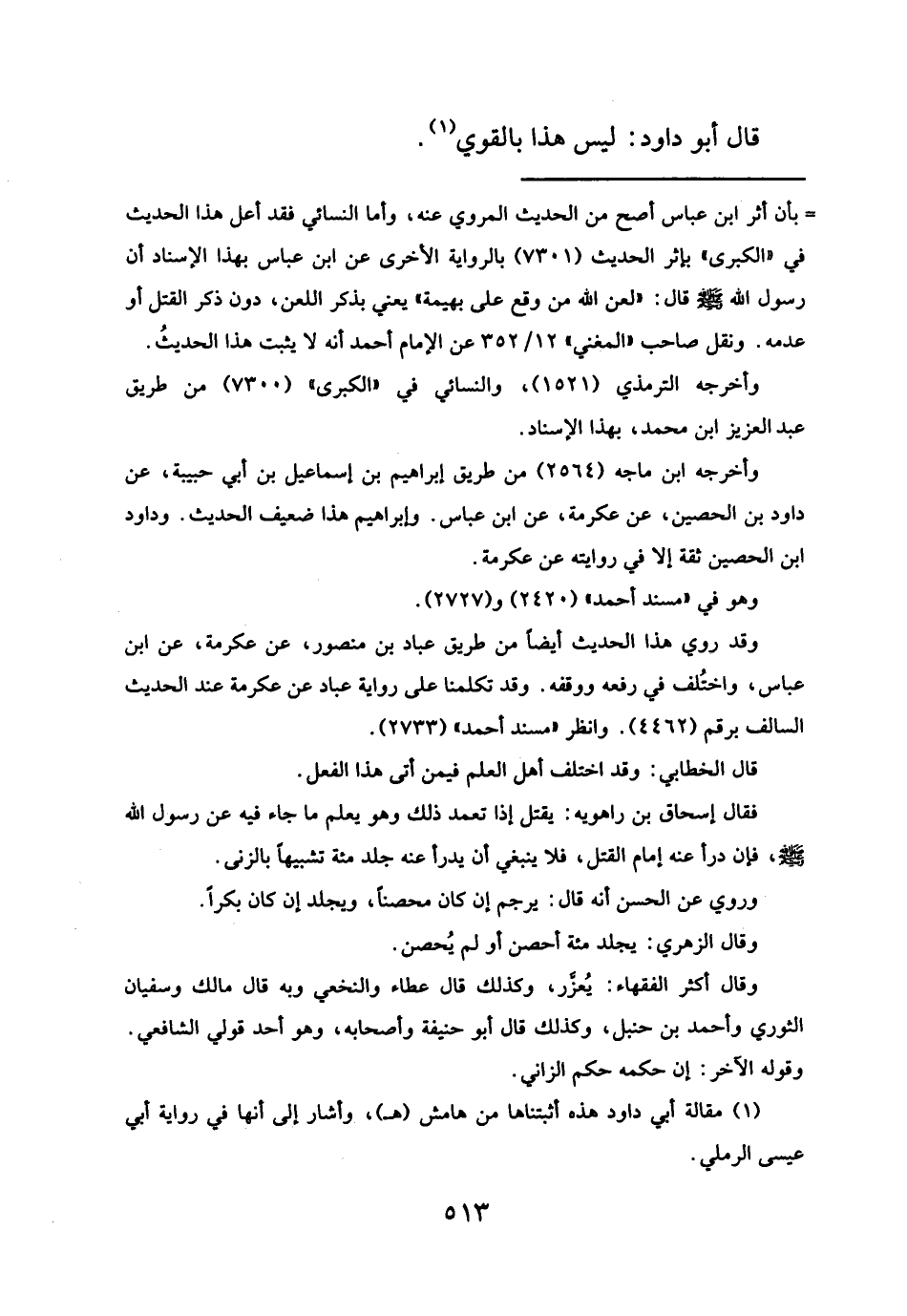 = بأن أثر ابن عباس أصح من الحديث المروي عنه، وأما النسائي فقد أعل هذا الحديث في "الكبرى" بإثر الحديث (٧٣٠١) بالرواية الأخرى عن ابن عباس بهذا الإسناد أن رسول الله - صلَّى الله عليه وسلم - قال: "لعن الله من وقع على بهيمة" يعني بذكر اللعن، دون ذكر القتل أو عدمه. ونقل صاحب "المغني" ١٢/ ٣٥٢ عن الإِمام أحمد أنه لا يثبت هذا الحديثُ.