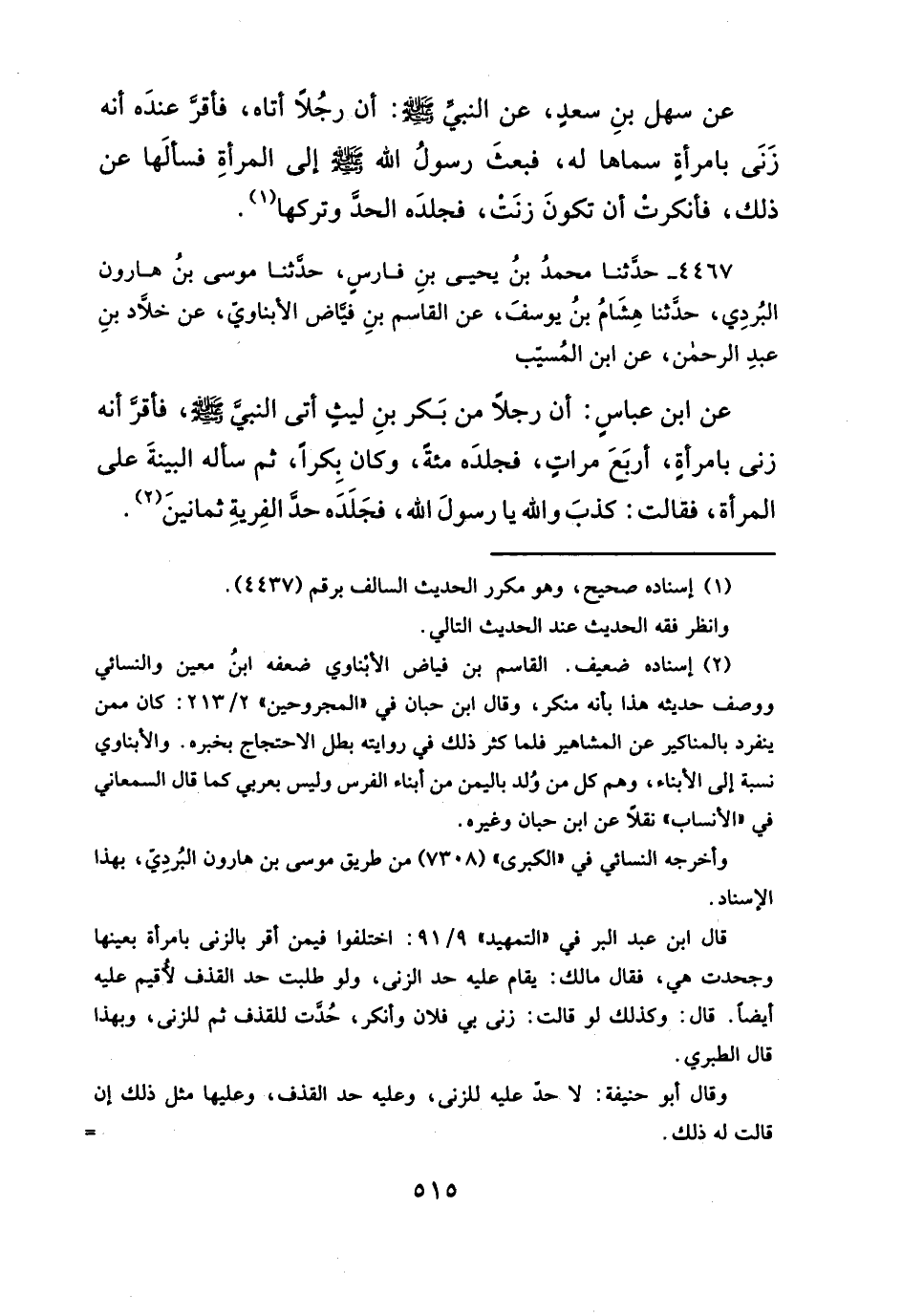 عن ابن عباسٍ: أن رجلاً من بَكر بنِ ليثٍ أتى النبيَّ - صلَّى الله عليه وسلم -، فأقرَّ أنه زنى بامرأةٍ، أربَعَ مراتٍ، فجلدَه مئةً، وكان بِكراً، ثم سأله البينةَ على المرأة، فقالت: كذبَ والله يا رسولَ الله، فجَلَدَه حدَّ الفِريةِ ثمانينَ (¬٢).