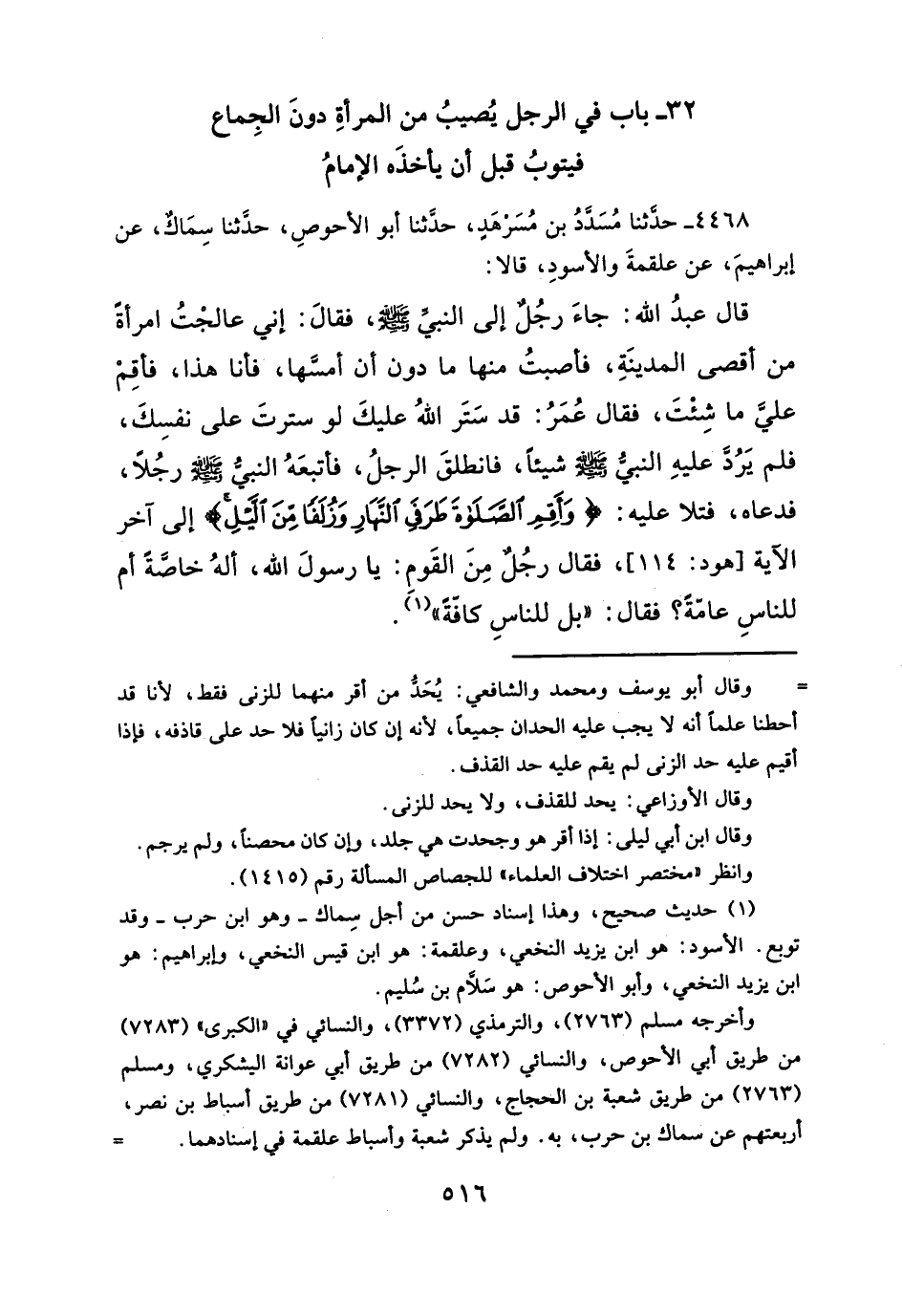 ٣٢ - باب في الرجل يُصيبُ من المرأةِ دونَ الجِماع فيتوبُ قبل أن يأخذَه الإمامُ