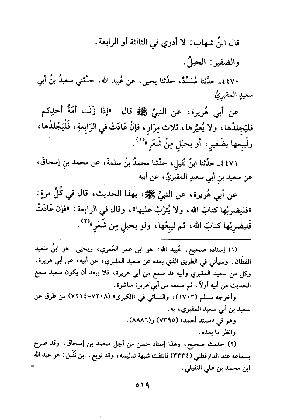 عن أبي هُريرة، عن النبي - صلَّى الله عليه وسلم -، بهذا الحديث، قال في كُل مرةٍ: "فليضربْها كتابَ الله، ولا يُثرِّبْ عليها"، وقال في الرابعة: "فإن عَادَتْ فَليضرِبْها كتابَ الله، ثم ليبِعها، ولو بحبلٍ مِن شَعَرٍ" (¬٢).