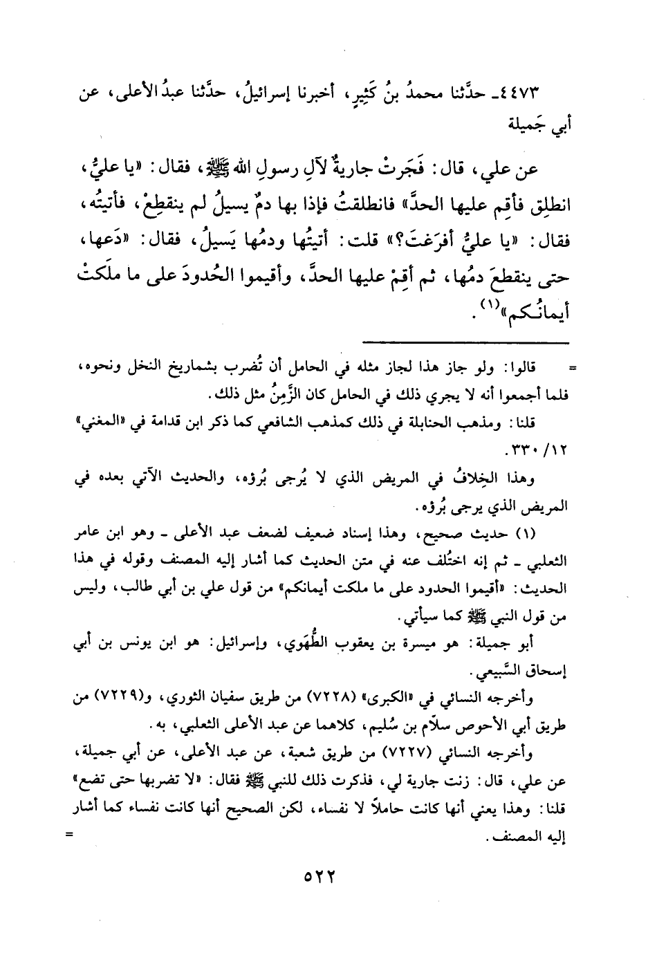٤٤٧٣ - حدَّثنا محمدُ بنُ كَثِيرٍ، أخبرنا إسرائيلُ، حدَّثنا عبدُ الأعلى، عن أبي جَميلة عن علي، قال: فَجَرتْ جاريةٌ لآلِ رسولِ الله - صلَّى الله عليه وسلم -، فقال: "يا عليُّ، انطلِق فأقِم عليها الحدَّ" فانطلقتُ فإذا بها دمٌ يسيلُ لم ينقطِعْ، فأتيتُه، فقال: "يا عليٍّ أفرَغتَ؟ " قلت: أتيتُها ودمُها يَسيلُ، فقال: "دَعها، حتى ينقطعَ دمُها، ثم أقِمْ عليها الحدَّ، وأقيموا الحُدودَ على ما ملَكتْ أيمانُكم" (¬١).