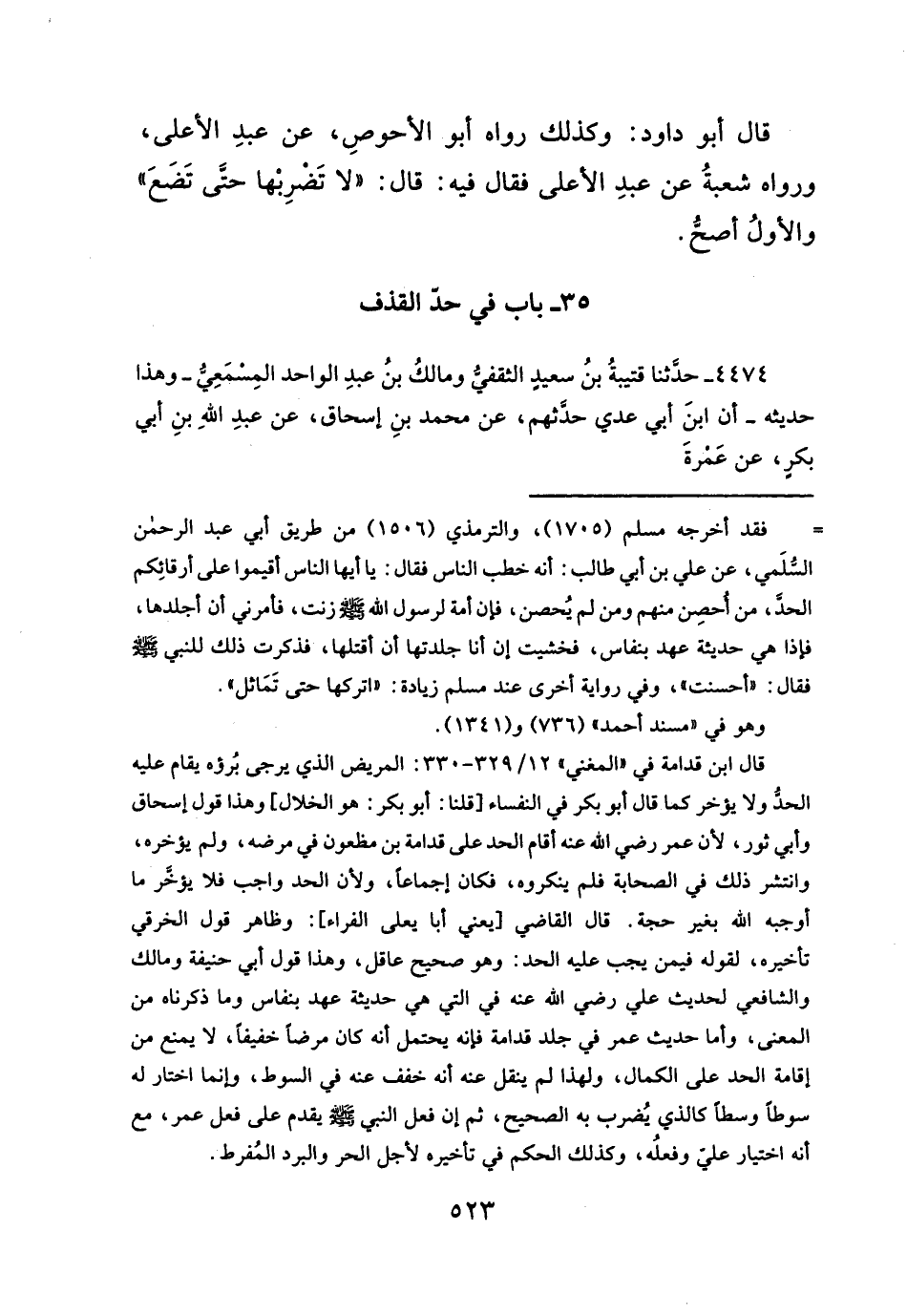 قال ابن قدامة في "المغني" ١٢/ ٣٢٩ - ٣٣٠: المريض الذي يرجى برؤه يقام عليه الحدُّ ولا يؤخر كما قال أبو بكر في المساء [قلنا: أبو بكر: هو الخلال] وهذا قول إسحاق وأبي ثور، لأن عمر رضي الله عنه أقام الحد على قدامة بن مظعون في مرضه، ولم يؤخره، وانتشر ذلك في الصحابة فلم ينكروه، فكان إجماعا، ولأن الحد واجب فلا يؤخر ما أوجبه الله بغير حجة. قال القاضي [يعني أبا يعلى الفراء]: وظاهر قول الخرقي تأخيره، لقوله فيمن يجب عليه الحد: وهو صحيح عاقل، وهذا قول أبي حنيفة ومالك والشافعي لحديث علي رضي الله عنه في التي هي حديثة عهد بنفاس وما ذكرناه من المعنى، وأما حديث عمر في جلد قدامة فإنه يحتمل أنه كان مرضا خفيفاً، لا يمنع من إقامة الحد على الكمال، ولهذا لم يقل عنه أنه خفف عنه في السوط، وإنما اختار له سوطاً وسطا كالذي يُضرب به الصحيح، ثم إن فعل النبي - صلَّى الله عليه وسلم - يقدم على فعل عمر، مع أنه اختيار علي وفعلُه، وكذلك الحكم في تأخيره لأجل الحر والبرد المُفرط.
