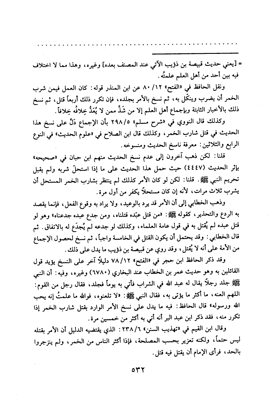 وقد ذكر الحافظ ابن حجر في "الفتح" ١٢/ ٧٨ دليلاً آخر على النسخ يؤيد قول القائلين به وهو حديث عمر بن الخطاب عند البخاري (٦٧٨٠) وغيره، وفيه: أن النبي - صلَّى الله عليه وسلم - جلد رجلاً يقال له عبد الله في الشراب فأتي به يوماً فجلد، فقال رجل من القوم: اللهم العنه، ما أكثر ما يؤتى به، فقال النبي - صلَّى الله عليه وسلم -: "لا تلعنوه، فوالله ما علمتُ إنه يحب الله ورسوله" قال الحافظ: فيه ما يدل على نسخ الأمر الوارد بقتل شارب الخمر إذا تكرر منه، فقد ذكر ابن عبد البر أنه أتي به أكثر من خمسين مرة.