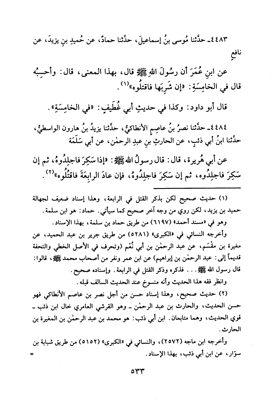 (¬١) حديث صحيح لكن بذكر القتل في الرابعة، وهذا إسناد ضعيف لجهالة حميد بن يزيد، لكن روي من وجه آخر صحيح كما سيأتي. حماد: هو ابن سلمة.
