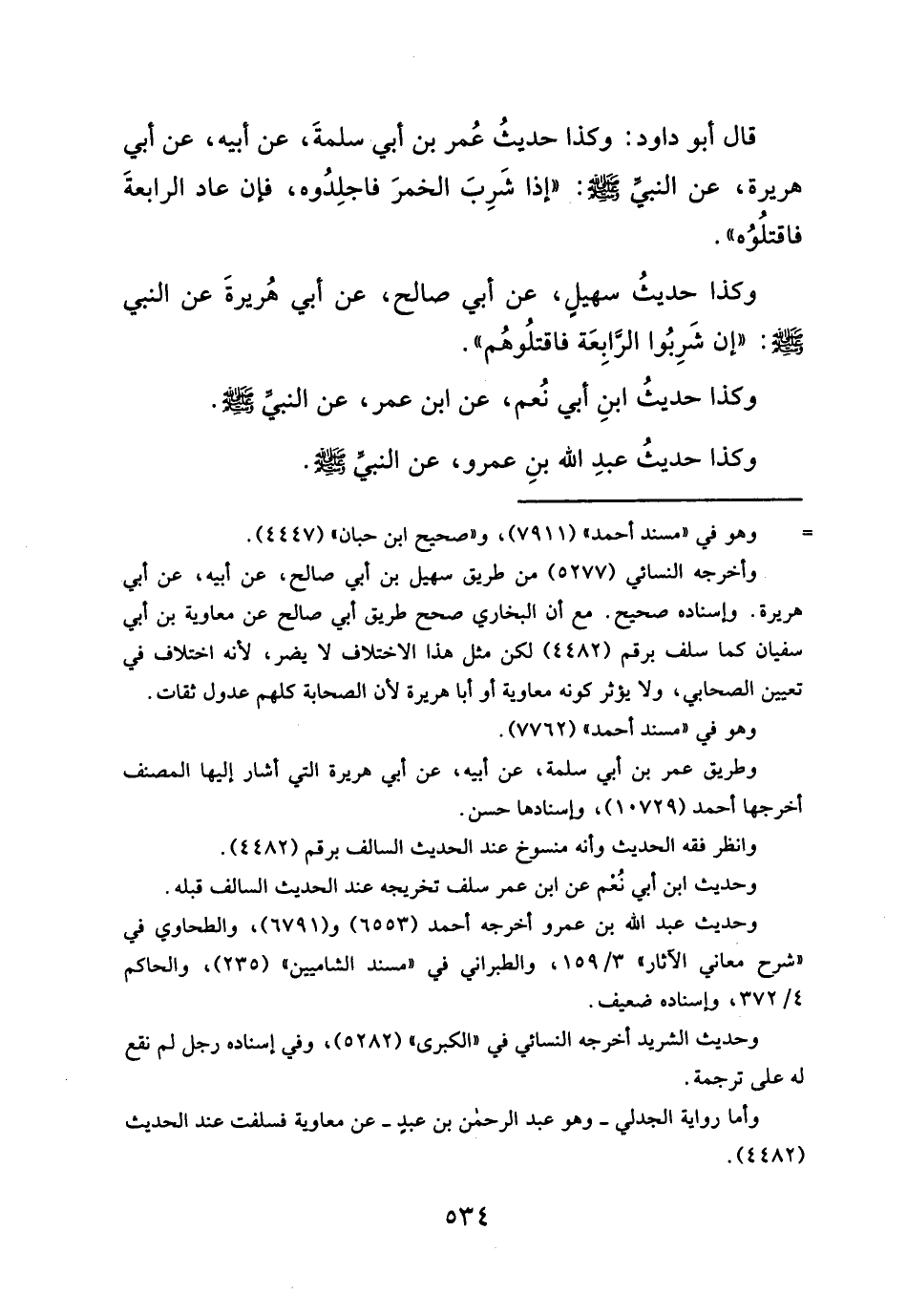 قال أبو داود: وكذا حديثُ عُمر بن أبي سلمةَ، عن أبيه، عن أبي هريرة، عن النبي - صلَّى الله عليه وسلم -: "إذا شَرِبَ الخمرَ فاجلِدُوه، فإن عاد الرابعةَ فاقتلُوُه".