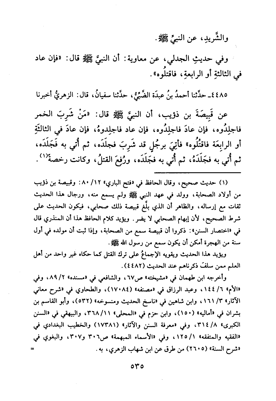 ٤٤٨٥ - حدَّثنا أحمدُ بنُ عبدَة الضَّبِّيُّ، حدَّثنا سفيانُ، قال: الزهريُّ أخبرنا عن قَبِيصَةَ بن ذؤيب، أن النبيَّ -صلَّى الله عليه وسلم- قال: "مَنْ شَرِبَ الخمر فاجلِدُوه، فإن عادَ فاجلِدُوه، فإن عاد فاجلِدوهُ، فإن عادَ في الثالثَةِ أو الرابِعَة فاقتُلُوه" فأتِيَ برجُلٍ قد شَرِبَ فجلَدَه، ثم أُتي به فَجَلَدَه، ثم أُتي به فجَلَدَهُ، ثم أُتي به فجَلَدَه، ورُفِعَ القتلُ، وكانت رخصةً (¬١).