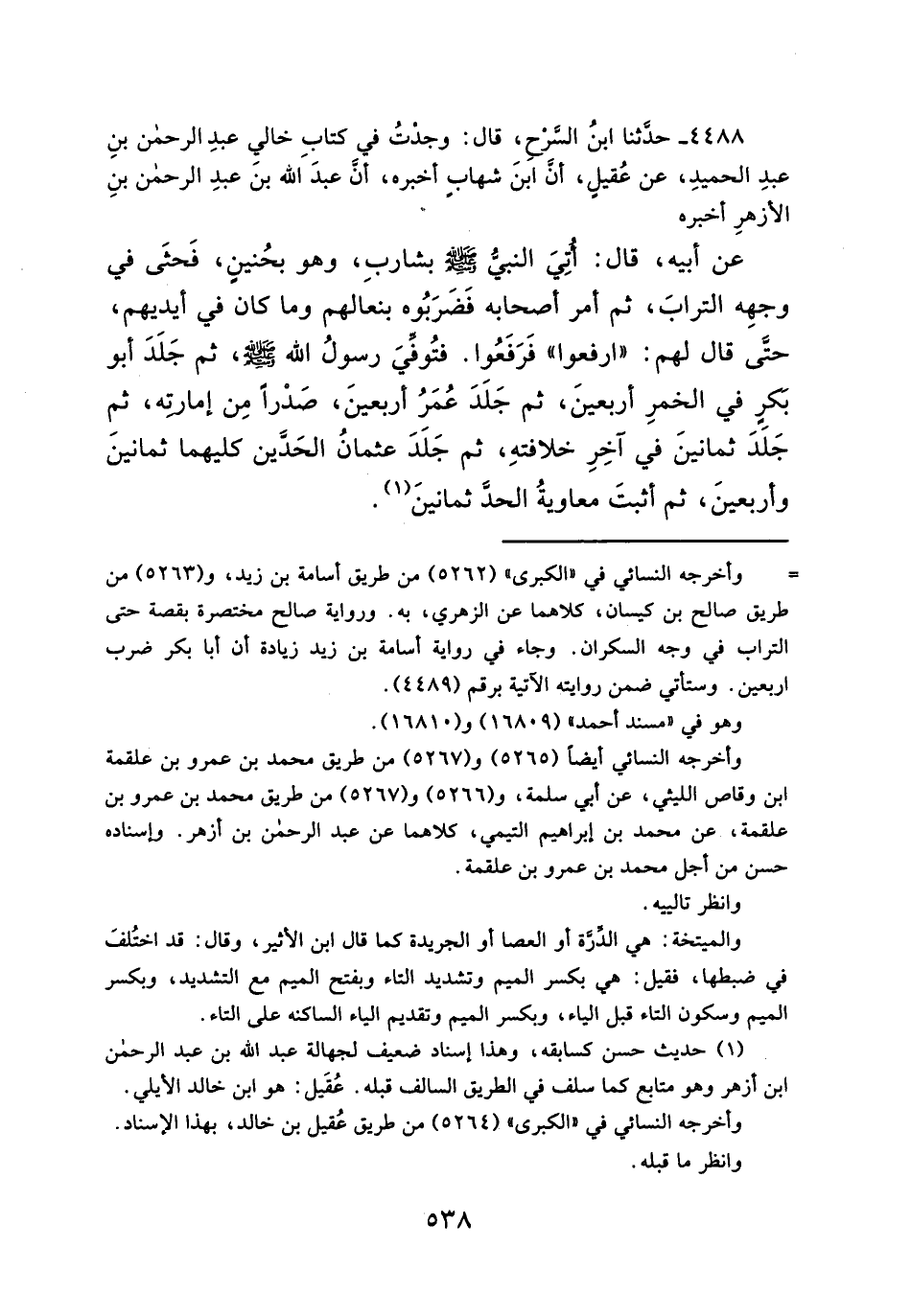 ٤٤٨٨ - حدَّثنا ابنُ السَّرْحِ، قال: وجدْتُ في كتابِ خاليِ عبدِ الرحمن بنِ عبدِ الحميدِ، عن عُقيلٍ، أن ابنَ شهابٍ أخبره، أنَّ عبدَ الله بن عبدِ الرحمن بنِ الأزهرِ أخبره عن أبيه، قال: أُتِيَ النبيُّ -صلَّى الله عليه وسلم- بشاربِ، وهو بحُنينٍ، فَحثَى في وجهِه الترابَ، ثم أمر أصحابه فَضَرَبُوه بنعالهم وما كان في أيديهم، حتَّى قال لهم: "ارفعوا" فَرَفَعُوا. فتُوفِّيَ رسولُ الله - صلَّى الله عليه وسلم -، ثم جَلَدَ أبو بَكرٍ في الخمرِ أربعينَ، ثم جَلَدَ عُمَرُ أربعينَ، صَدْراً مِن إمارتِه، ثمِ جَلَدَ ثمانينَ في آخِرِ خلافتهِ، ثم جَلَدَ عثمانُ الحَدَّين كليهما ثمانين وأربعينَ، ثم أثبتَ معاويةُ الحدَّ ثمانينَ (¬١).
