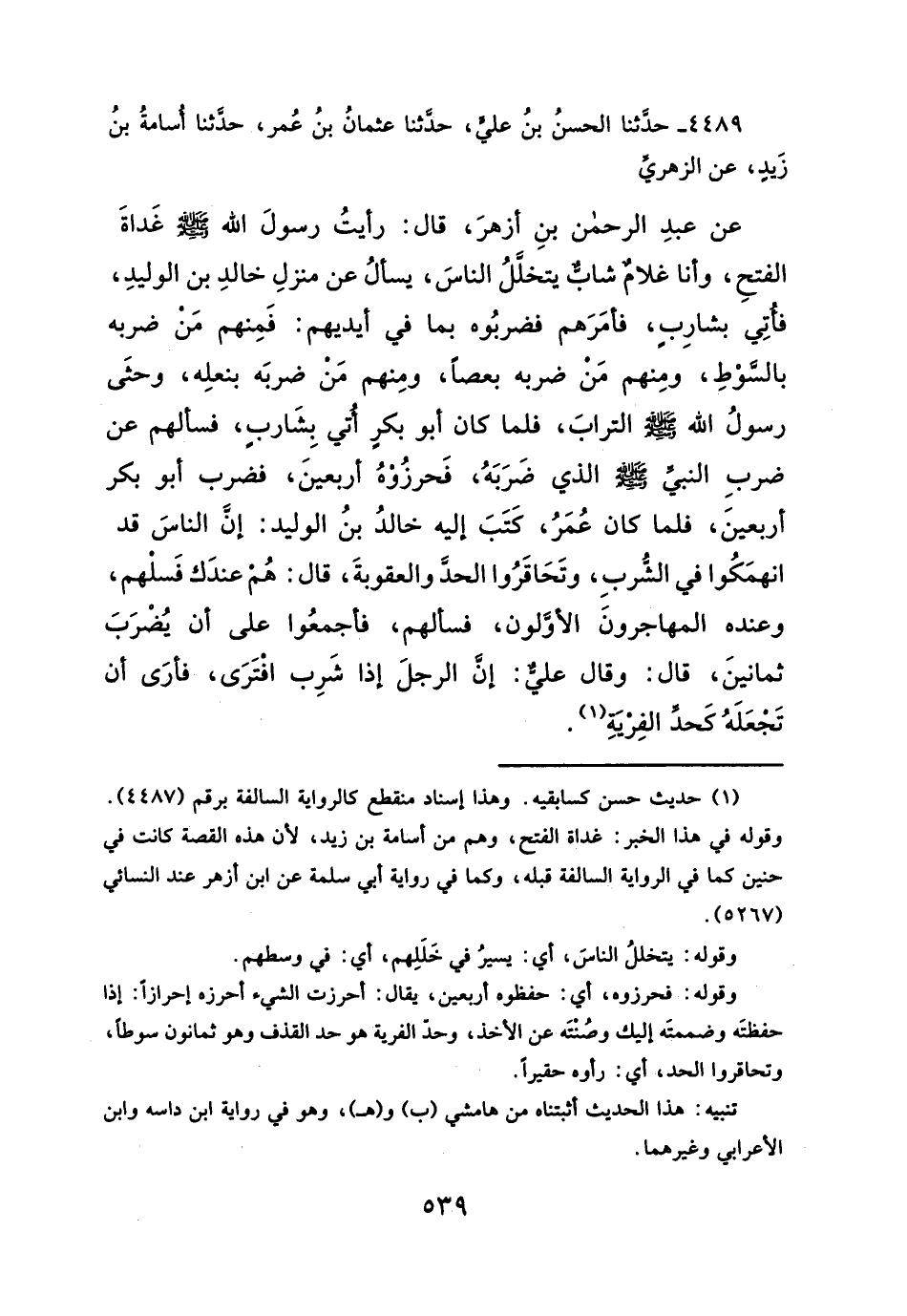عن عبدِ الرحمن بنِ أزهرَ، قال: رأيتُ رسولَ الله - صلَّى الله عليه وسلم - غَداةَ الفتحِ، وأنا غلامٌ شابٌّ يتخلَّلُ الناسَ، يسألُ عن منزلِ خالدِ بن الوليدِ، فأُتِيَ بشارِبٍ، فأمَرهم فضربُوه بما في أيديهم: فَمِنهم مَن ضربه بالسَّوْطِ، ومِنهم مَن ضربه بعصاً، ومِنهم مَن ضربَه بنعلِه، وحثَى رسولُ الله - صلَّى الله عليه وسلم - الترابَ، فلما كان أبو بكرٍ أُتي بِشَاربٍ، فسألهم عن ضربِ النبيِّ - صلَّى الله عليه وسلم - الذي ضَرَبَهُ، فَحرزُوْهُ أربعينَ، فضرب أبو بكر أربعينَ، فلما كان عُمَرُ، كتَبَ إليه خالدُ بنُ الوليد: إنَّ الناسَ قد انهمَكُوا في الشُّربِ، وتَحَاقَرُوا الحدَّ والعقوبةَ، قال: هُمْ عندَك فَسلْهم، وعنده المهاجرونَ الأوَّلون، فسألهم، فأجمعُوا على أن يُضْرَبَ ثمانينَ، قال: وقال عليٌّ: إن الرجلَ إذا شَرِب افْتَرَى، فأرَى أن تَجعَلَهُ كَحدِّ الفِرْيَةِ (¬١).