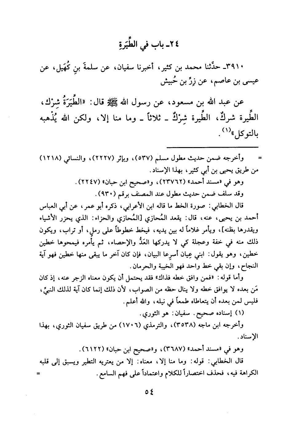 عن عبد الله بن مسعود، عن رسول الله - صلَّى الله عليه وسلم - قال: "الطِّيَرَةُ شِرْك، الطِّيرة شركٌ، الطيرة شِرْكٌ -ثلاثاً- وما منا إلا، ولكن اللهُ يُذْهبه بالتوكل" (¬١).