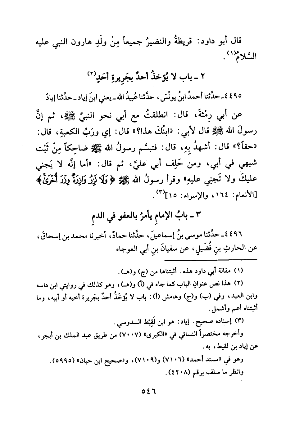(¬٢) هذا نص عنوانِ الباب كما جاء في (أ) و (هـ)، وهو كذلك في روايتي ابن داسه وابن العبد، وفي (ب) و (ج) وهامش (أ): باب لا يُؤخَذُ أحدٌ بجَريرة أخيه أو أبيه، وما أثبتناه أعم وأشمل.