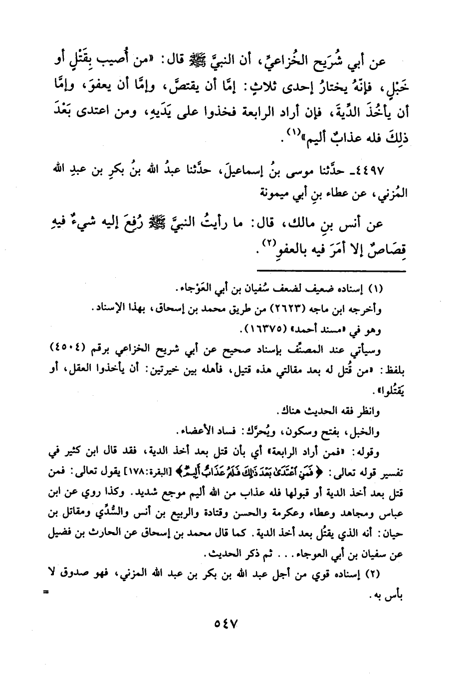 عن أبي شُرَيح الخُزاعيِّ، أن النبيَّ -صلَّى الله عليه وسلم- قال: "من أُصيب بِقَتلٍ أو خَبْلِ، فإنّهُ يختارُ إحدى ثلاثٍ: إمَّا أن يقتصَّ، وإما أن يعفوَ، وإمَّا أن يأخُذَ الديةَ، فإن أراد الرابعة فخذوا على يَدَيهِ، ومن اعتدى بَعْدَ ذلِكَ فله عذاب أليم" (¬١).