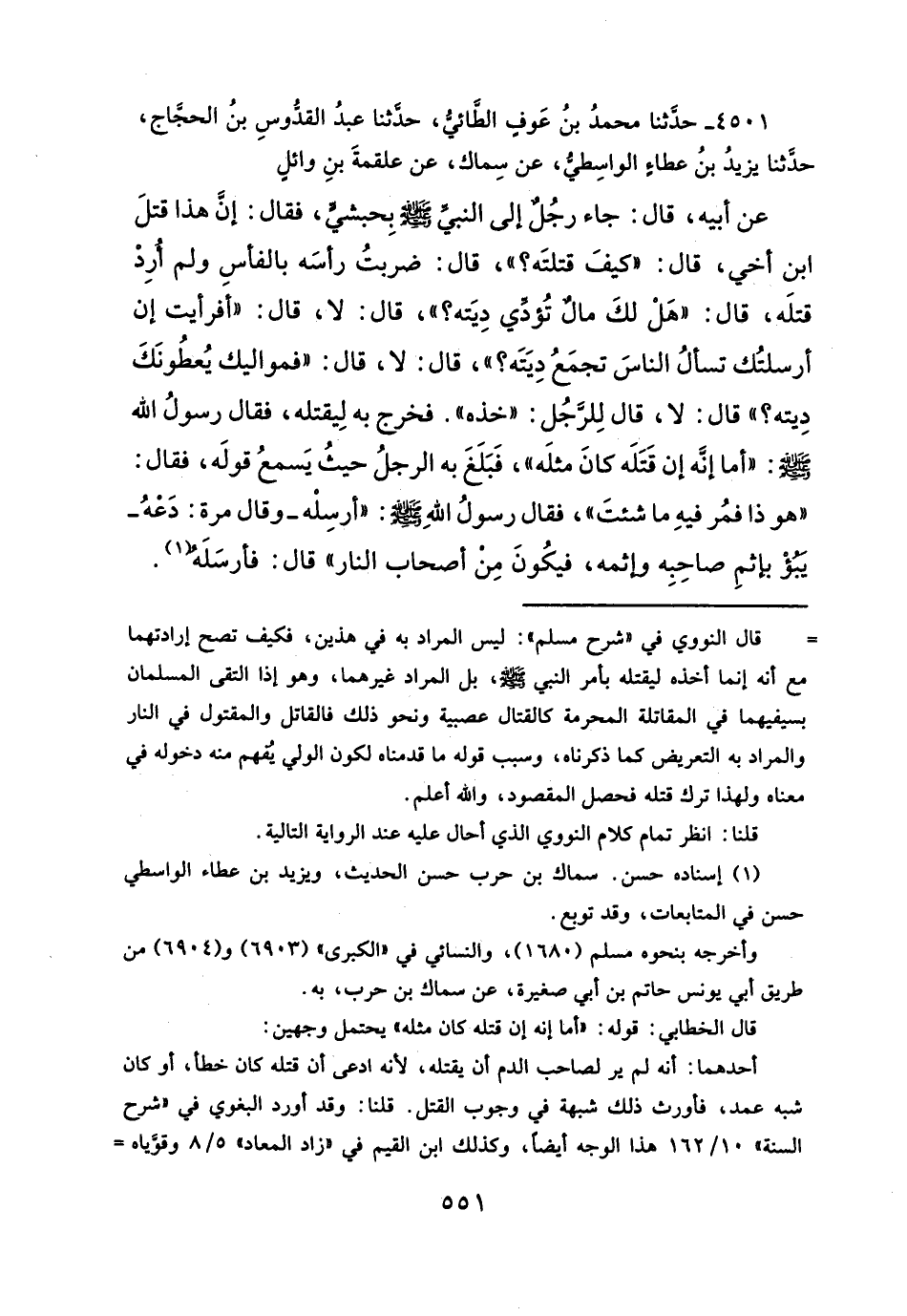 عن أبيه، قال: جاء رجُلٌ إلى النبي - صلَّى الله عليه وسلم - بِحبشيٍّ، فقال: إنَّ هذا قتلَ ابن أخي، قال: "كيفَ قتلتَه؟ "، قال: ضربتُ رأسَه بالفأسِ ولم أُرِدْ قتلَه، قال: "هَلْ لكَ مال تُؤدي دِيَته؟ "، قال: لا، قال: "أفرأيت إن أرسلتُك تسألُ الناسَ تجمَعُ دِيَتَه؟ "، قال: لا، قال: "فمواليك يُعطُونَكَ دِيته؟ " قال: لا، قال لِلرَّجُلِ: "خذه". فخرج به لِيقتله، فقال رسولُ الله - صلَّى الله عليه وسلم -: "أما إنَّه إن قَتَلَه كانَ مثلَه"، فَبَلَغَ به الرجلُ حيثُ يَسمعُ قولَه، فقال: "هو ذا فمُر فيهِ ما شئتَ"، فقال رسولُ الله - صلَّى الله عليه وسلم -: "أرسِلْه -وقال مرة: دَعْهُ- يَبُؤْ بإثمِ صاحِبِه وإثمه، فيكُونَ مِنْ أصحاب النار" قال: فأرسَلَهُ (¬١).