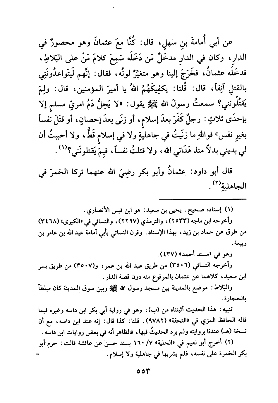 عن أبي أُمامةَ بنِ سهلٍ، قال: كُنَّا معَ عثمانَ وهو محصورٌ في الدارِ، وكان في الدارِ مدخَلٌ مَن دَخَلَه سَمِعَ كلامَ مَنْ على البَلاطِ، فدخَلَه عثمانُ، فخَرَجَ إلينا وهو متغيِّرٌ لونُه، فقال: إنَّهم لَيتَواعدُونَنِي بالقتلِ آنِفاً، قال: قُلنا: يكفِيكَهُمُ اللهُ يا أميرَ المؤمنين، قال: ولِمَ يَقتُلُونني؟ سمعتُ رسولَ الله - صلَّى الله عليه وسلم - يقول: "لا يَحِلُّ دَمُ امرئٍ مسلمٍ إلا بإحدَى ثلاثٍ: رجل كَفَرَ بعدَ إسلامٍ، أو زنَى بعدَ إحصانٍ، أو قتَلَ نفساً بغيرِ نفس" فواللهِ ما زنَيتُ في جاهليةٍ ولا في إسلامٍ قَطُّ، ولا أحببتُ أن لي بديني بدلاً منذ هَدَاني الله، ولا قتلتُ نفساً، فبِمَ يَقتلونَني؟ (¬١).