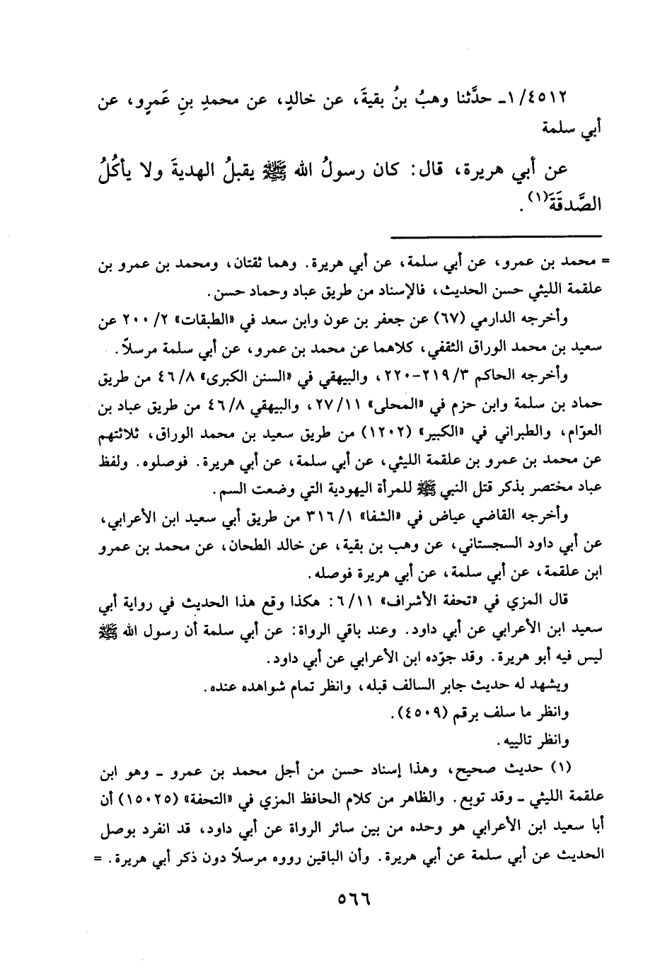 عن أبي هريرة، قال: كان رسولُ الله - صلَّى الله عليه وسلم - يقبلُ الهديةَ ولا يأكُلُ الصَّدقَةَ (¬١).
