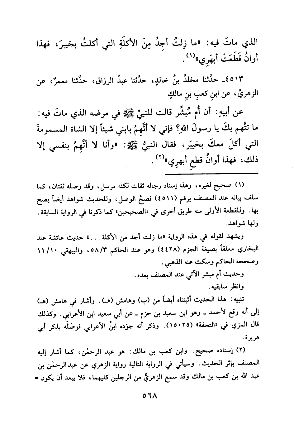 ويشهد لقوله في هذه الرواية "ما زلت أجد من الأكلة ... " حديث عائشة عند البخاري معلقاً بصيغة الجزم (٤٤٢٨) وهو عند الحاكم ٥٨/ ٣، والبيهقي ١٠/ ١١